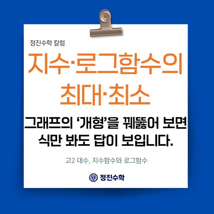 안녕하세요 생각의 깊이가 다른 수학, 세종시 도담동 수학 전문 정진수학입니다. 지난 글에서는 지수함수와 로그함수가 y=x 대칭인 역함수 관계이며, 그래프의 모양은 오직 밑(a)이 결정한다는 사실을 다루었습니다. 이번 글의 주제는 [함수의 최대와 최소]입니다. 이 단원은 그래프의 성질을 얼마나 정확하게 이해하고 있는지를 묻는 중요한 파트입니다. 개념을 공부할 때 함수의 그래프를 그려보면서 증가와 감소(방향성)을 정확히 이해하고 있다면, 이것을 문제에 적용할 때는 복잡한 그래프를 그리지 않고도 식의 구조만으로 정확하고 빠르게 답을 찾아낼 수 있습니다. 오늘은 '밑(a)'이 결정하는 방향성을 통해 최대·최소 문....... <img src="https://blogthumb.pstatic.net/MjAyNjAyMTBfMjkz/MDAxNzcwNzE2MjAzMDQ1.H10cSsrecNHnpdWNaelpsrbsqLQItloxguEm6i28HCYg.CkwgpUl2lJ8ztnOBt3OZYaAdMWAJ1t4ETRoZPKVFhHYg.PNG/%C1%A4%C1%F8%BC%F6%C7%D0_%C4%AE%B7%B3_-_%C1%F6%BC%F6%B7%CE%B1%D7%C7%D4%BC%F6%C0%C7_%C3%D6%B4%EB%C3%D6%BC%D2.png?type=s3" />