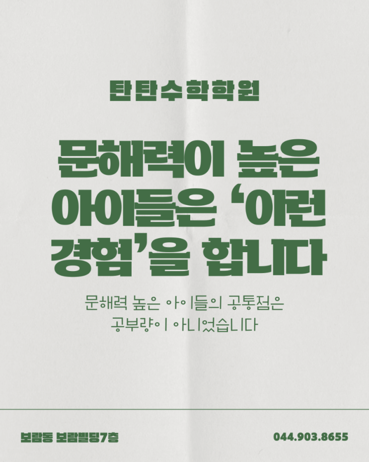 문해력이 높은 아이들이 공통으로 가진 ‘경험’의 차이 “우리 아이는 책도 읽는데 왜 글을 잘 이해하지 못할까요?” 사실 문해력은 단순히 ‘읽기 양’만으로 결정되지 않습니다. 문해력이 높은 아이들을 자세히 살펴보면, 공통적으로 특정한 경험의 폭을 가지고 있습니다. ‘읽기’가 아니라 ‘이해하고 말해본’ 경험 문해력이 높은 아이들은 책을 읽고 끝내지 않습니다. 내용을 자기 말로 설명해 본 경험이 많습니다. “주인공이 왜 그런 선택을 했을까?” “이 장면을 한 문장으로 말해보면?” “나라면 어떻게 했을까?” 이처럼 생각하고 말로 정리의 과정을 반복한 아이들은 글의 구조와 핵심을 자연스럽게 파악하게 됩니다. 문해력은 ‘....... <img src="https://blogthumb.pstatic.net/MjAyNjAyMTFfNjUg/MDAxNzcwNzY3MzE3MDQ4.2Z15PfaFzOnKxqC55yqjAP7MRaUx8-4LgU0mzvEJ1Ccg.9UUxV-ZAB42wjaXGO_0Vq5s7oGgrppLynm2amZREicEg.PNG/900%A3%DFGreen_Neutral_Simple_Paper_Texture_Motivational_Quote_Instagram_Post%A3%DF202.png?type=s3" />