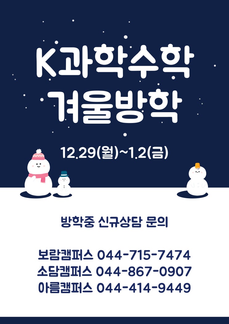 12.29(월)부터 1.2(금)까지 학원이 겨울방학에 들어갑니다. 개별 수업 및 보강은 담당 강사에게 문의 부탁드립니다. 방학 중 신규상담은 학원 전화로 문의주시면 착신전환으로 담당자가 상담드리겠습니다. 한해 마무리 잘 하시고 새해 복 많이 받으세요 ^^ <img src="https://blogthumb.pstatic.net/MjAyNTEyMjlfMjI0/MDAxNzY2OTc4Mzc4ODAw.o7tK8RHmLaKwFPwghQ1vw6N7QtdzyjZVC8GYvBjZl6kg.HWy4SiavjzeDY3-QAFjScqcsM8szk6Dfb28hxmu5FMIg.JPEG/%C1%A6%B8%F1%C0%BB-%C0%D4%B7%C2%C7%D8%C1%D6%BC%BC%BF%E4_-001.jpg?type=s3" />