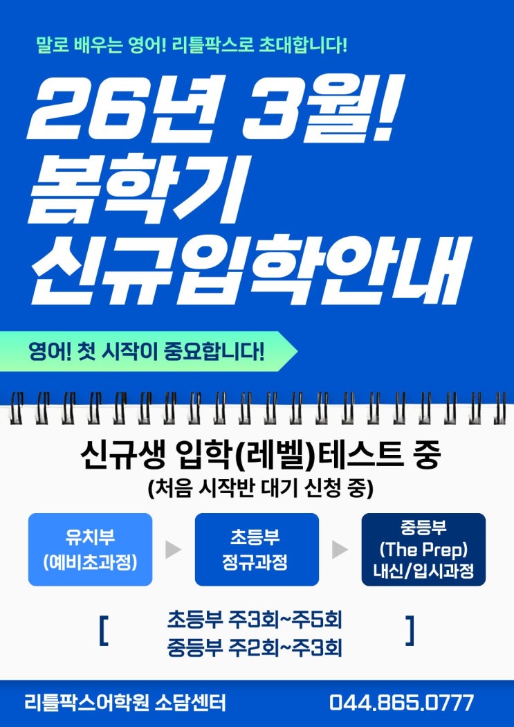 안녕하세요! 세종 영어학원! 리틀팍스어학원 소담센터 & 더 프렙입니다. 어느덧 26년이 시작되었습니다! 원하시는 모든 일 이루시고 무엇보다 더욱 건강하시길 바라겠습니다~^^ 26년 3월 봄학기, 영어의 ‘처음’을 제대로 시작합니다! 영어 학습에서 가장 중요한 시기가 언제일까요? 많은 학부모님들이 “조금 더 크면 시작해도 되지 않을까요?”라고 질문하시지만, 실제로 아이들의 영어 실력 격차는 ‘언제 시작했느냐’보다 ‘어떻게 시작했느냐’에서 벌어집니다. 리틀팍스어학원 소담센터는 26년 3월 봄학기를 맞아 처음 시작반 및 정규반 반배치를 시작합니다. 영어를 이제 막 시작하는 아이들부터, 이미 학습 경험이 있는 학생들까지....... <img src="https://blogthumb.pstatic.net/MjAyNjAxMDhfNDIg/MDAxNzY3ODQ1Njk4Mzg0.LLyddf1iFQcUdbGpsSC6hYtKqC4LrYsFi1f8f7lBSxsg.gnHIDUe05E40PkYKPN_nBL-_zRGCeXwmOwGdmSuW0Fkg.JPEG/%C1%A6%B8%F1%C0%BB_%C0%D4%B7%C2%C7%D8%C1%D6%BC%BC%BF%E4._%282%29.jpg?type=s3" />