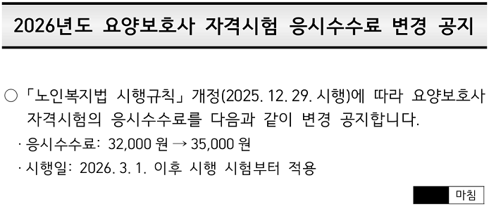 2026년도 요양보호사 자격시험 응시수수료 변경 공지