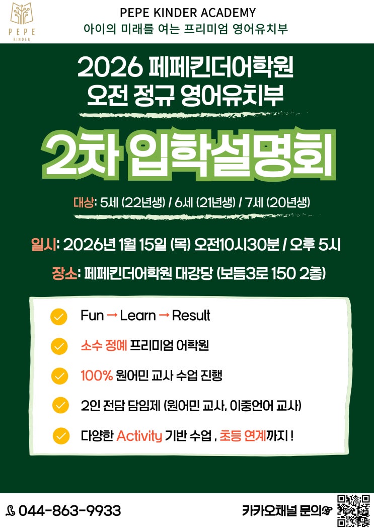 페페킨더어학원 오전 정규유치부 입학설명회 소수정예 | 검증된 학습 시스템 오전 정규유치부 입학설명회 일정 일시: 1월 15일(목) 오전 10시 30분 / 오후 5시 대상: 내년 5세(22년생) ~ 내년 7세(20년생) 입학설명회 및 신청 안내 정원이 매우 제한되어 있어, 참석을 원하시는 경우 아래 신청 링크를 통해 사전 신청해 주시기 바랍니다. 2026학년도) 1월 15일 (목) 오전 정규유치부 설명회 신청 네이버폼 페페킨더의 오전 정규유치부는 소수 정원제로 운영됩니다. ✔ 5세 정원 8명 ✔ 6세 정원 10명 ✔ 7세 정원 10명 "아기밀 페페" Kids-First · High-Density English 아이 기준, 관리 밀도로 완성되는....... <img src="https://blogthumb.pstatic.net/MjAyNjAxMDhfNTcg/MDAxNzY3ODY0NzgzNzk0.9ZGLZWBU37yTwrsde_Xn8FWCvMTmkqmpsUi9lFwznBgg.wUWD_LwIGN6Y1giYqLF8hwHb2W-phUvTYNhmmJgst6wg.JPEG/asdasd.jpg?type=s3" />