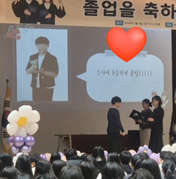 어제는 우리 방긋이의 졸업식. 우리 방긋이가 입학한지가 엊그제 같은데.. 벌써 졸업을 하더라구요ㅋㅋ 코로나로 입학식도 못한 학년. 수학여행도 못간 학년. 졸업식장에 다 같은 마음으로 모인 부모님들. 졸업식은 참 예쁘게 준비해주셔서 감사하더라구요. 졸업식장에서 왜우나? 싶었는데.. 저혼자 아이들 영상보며 ..안녕이란 노래 들으며 울었다는ㅋㅋ하하하ㅋㅋ 일하다가 늦어서 뛰어간 방긋이 졸업식. 입장도 못보고 맨 뒤에서 까치반 들고 종종ㅋ 그래도 우리 아들은 한 눈에 알아보겠더라구요. 도치맘ㅋㅋ 근데 입학할때 200명 넘었던거 같은데.. 반이 줄어서 7반이더라구요. 입학식때는 9반까지 있었는데.. 중학교도 작년에는 17반까지라....... <img src="https://blogthumb.pstatic.net/MjAyNjAxMTBfMjUw/MDAxNzY3OTc4Nzk4OTM2.T2icK2X_hHB51KerQ0CpjLa00iJXyLxCtSGkHeJpunsg.yQQUTNeYnLcHpHB1rHAha8jIZ-YgMJzqsdfwik2a0k0g.JPEG/900%A3%DF1767978793847.jpg?type=s3" />