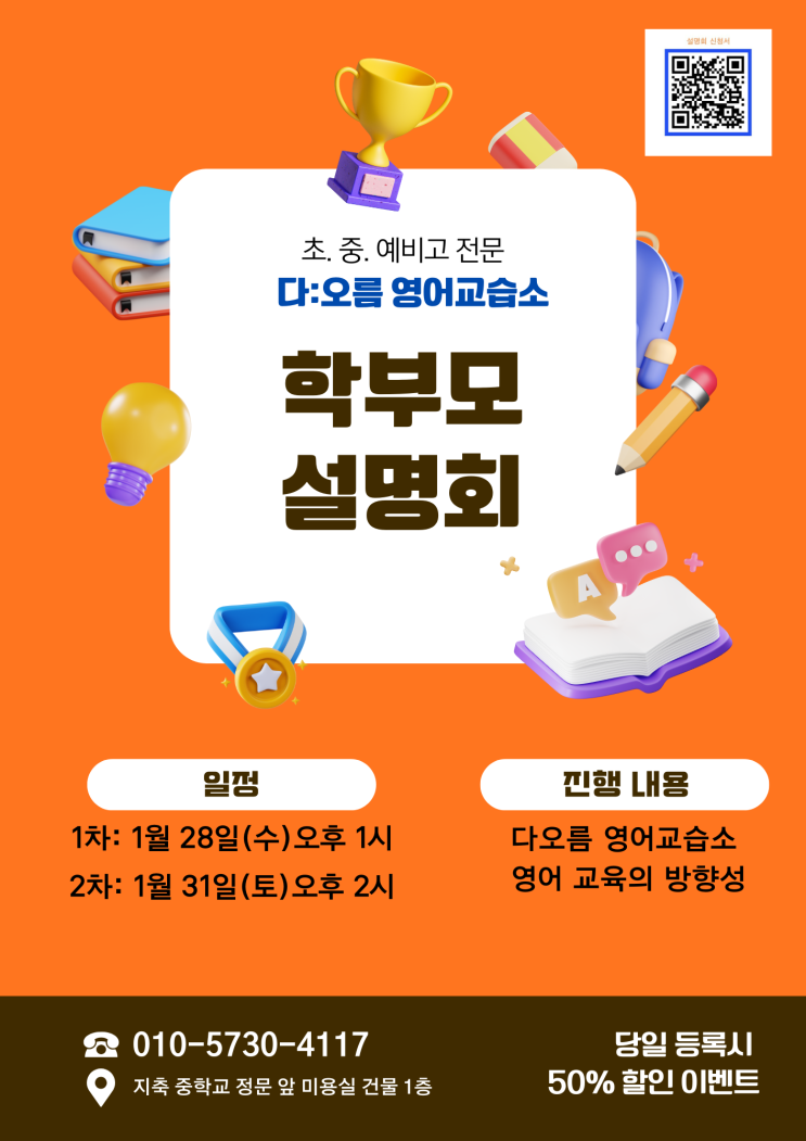 안녕하세요. 다오름 영어교습소입니다. 오픈을 기념하여 학부모 설명회를 진행합니다. 설명회 당일 등록하시는 분들께는 수강료 50% 할인 이벤트를 제공해 드리니 많은 관심과 참여 부탁드립니다. 아래 QR코드를 통해 신청서를 작성하신 후 참여해 주세요. 감사합니다. #지축중학교영어학원 #지축초영어학원 #지효초영어학원 #지축영어학원 #지축중영어교습소 #지축초영어교습소 #지효초영어교습소 #신원동영어학원 #삼송영어학원 #구파발영어학원 #고양시영어학원 <img src="https://blogthumb.pstatic.net/MjAyNjAxMTJfMTQy/MDAxNzY4MjE2NDg2NDkw.ln9784vwQpU6AvQNB8wlOxKlgGQ2SC41hTC-1VmyEHsg.sebyQMH2A6PKUQgje4jdCfElR3i0OIINLm8IGMBzqCEg.PNG/%B4%D9%BF%C0%B8%A7%C7%D0%BA%CE%B8%F0%BC%B3%B8%ED%C8%B8_%C0%FC%B4%DC%C1%F6_%BE%D5.png?type=s3" />