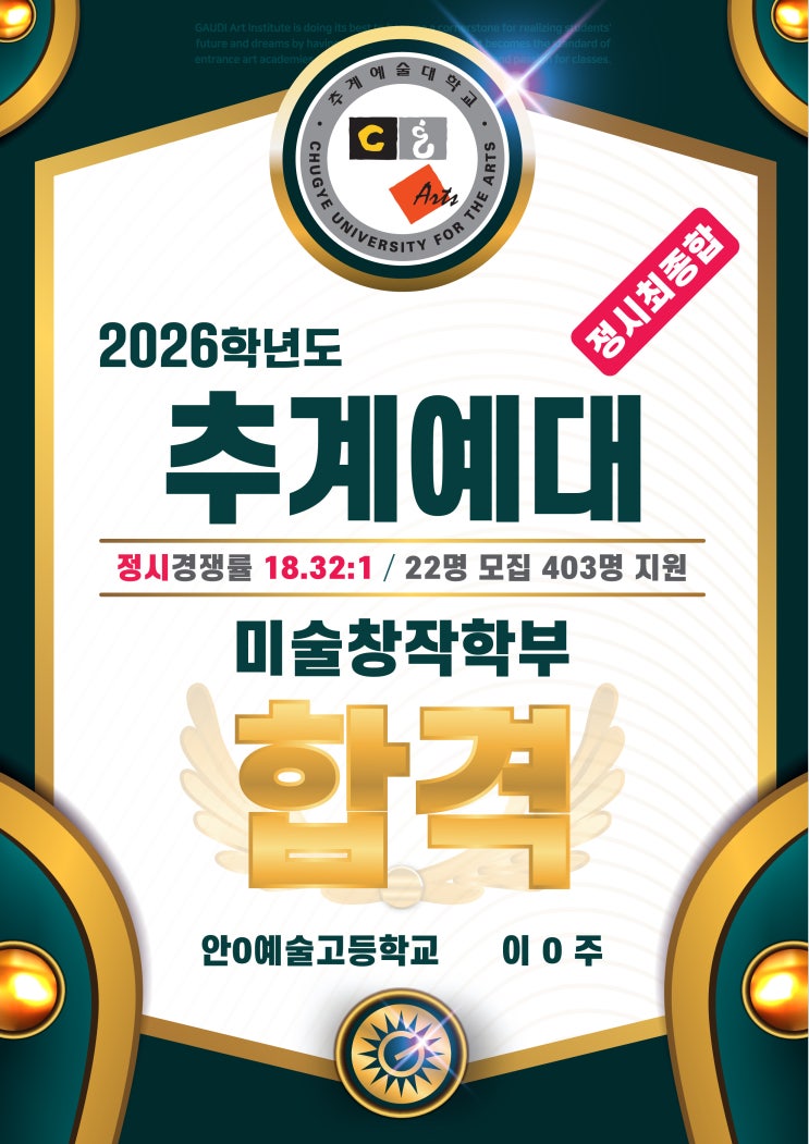 평촌미술학원 가우디 | 2026학년도 미대 정시 합격 발표! 추계예술대학교 미술창작학부 합격안내!!!