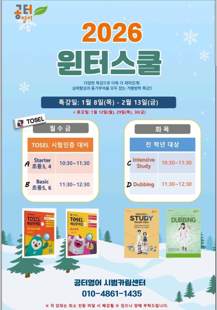☃️2026 Winter School☃️ "겨울방학 한 달, 1년치 영어 실력을 앞서가는 시간!!" 다양한 프로그램과 함께 영어의 재미를 발견하며, 실력까지 쑥쑥 성장하는 알찬 겨울방학이 되길 응원합니다!! [ Program ] >TOSEL 시험인증 대비 -대상: A반 초등3, 4학년(25년기준) GK5이상~ B반 초등5, 6학년(25년기준) GR101이상~ >Intensive Study 학습과정을 방학특강 기간 동안 2배로 학습하여 단계와 실력을 빠르게 향상시킬 수 있는 특강입니다. -대상: 모든 학년 및 레벨 All >Dubbing Script를 보지 않고 들리는 대로 따라 말해 보는 과정에서 듣기 능력이 강화되고 유창성에 도움을 줍니다. 반복적인 발화로 자연스럽게 문장 구....... <img src="https://blogthumb.pstatic.net/MjAyNTEyMjhfMjk5/MDAxNzY2OTE1NTk5Njk4.XFmkbpwiTFk385KdL7xcPkYPS8r95zdu4-W3Sphnrfsg.vuc6JK7uXBCMOU21E3hYBe77gHeOsygiqsoxDu9cFSkg.JPEG/900%A3%DFScreenshot%A3%DF20251225%A3%DF131131%A3%DFHancom_Office_Viewer.jpg?type=s3" />