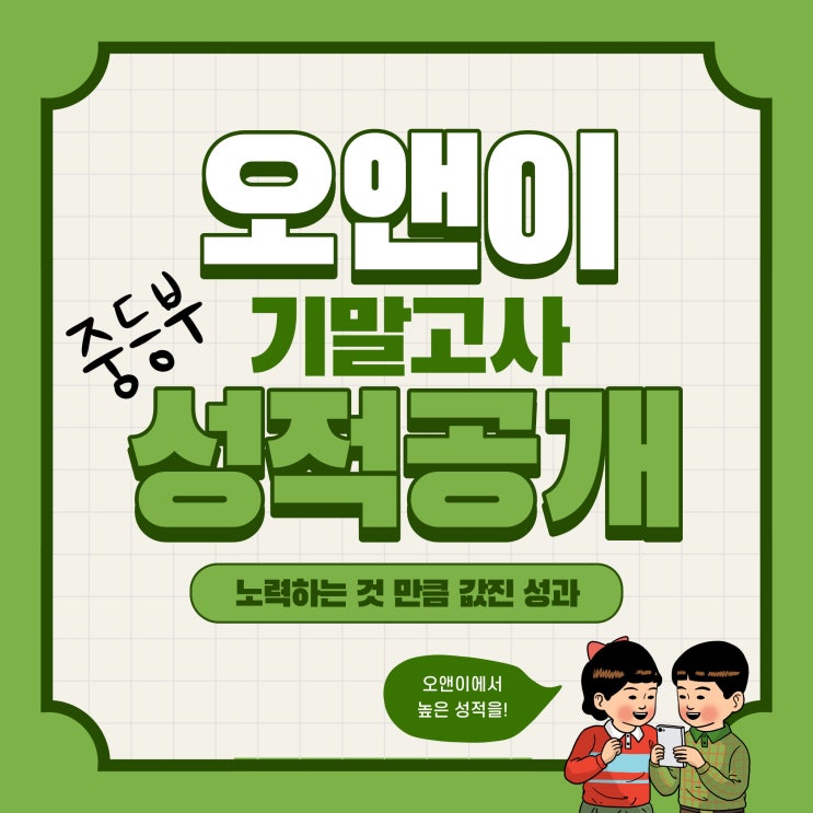 안녕하세요. 오름 앤 이룸 오앤이학원입니다 중1 첫 기말고사, 아이들이 해냈습니다! 얼마 전 치러진 중학교 1학년 첫 기말고사, 아이들이 정말 의미 있는 결과를 가져와 이렇게 소식을 전해드립니다. 처음 치르는 중학교 시험이라 긴장도, 부담도 컸을 텐데 아이들 모두 끝까지 잘 해주었습니다. 「중1 첫 기말고사, 아이들이 해냈습니다」 [중1 영어 기말고사 성적] 김지* — 100점 (발곡중) 김동* — 100점 (발곡중) 김건* — 100점 (발곡중) 장우* — 100점 (솔뫼중) 전혜* — 100점 (동암중) 원유* — 96점 (발곡중) 홍성* — 95.5점 (발곡중) 유해* — 94점 (동암중) 이태* — 91점 (발곡중) 첫 시험이라는 말이 무색할 만큼 아....... <img src="https://blogthumb.pstatic.net/MjAyNTEyMzBfMjg3/MDAxNzY3MDgxOTYzODU3.YJJtz6pB9neYk97IDhnFyHVaS459p4ml6SynqGb6I6Ig.XTCIiyEzBIMAWv_eiKuNjE6wh0LgflusnsLm--Gea2Qg.JPEG/%C1%A6%B8%F1%C0%BB_%C0%D4%B7%C2%C7%D8%C1%D6%BC%BC%BF%E4._%2816%29.jpg?type=s3" />