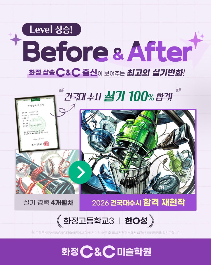 실기 100%, 2026건국대 수시 합격! -화정씨앤씨 출신이 강한 이유 #화정미술학원 #화정만화학원 #화정애니학원 #삼송미술학원 #삼송만화학원 #삼송애니학원 #원당미술학원 #능곡미술학원 #덕양구미술학원 #일산미술학원 #씨앤씨미술학원 #미대입시 #입시미술 #건국대 #수시 #2026건국대 #기초디자인 #기초소양 #기초조형 #소묘 #사고의전환 #발상과표현 #상황표현 #칸만화 #애니 #웹툰 #디지털드로잉 #신디크 #중등미술 안녕하세요! 화정씨앤씨미술학원입니다 :D 새해를 맞이하며 미대 입시를 준비하는 학생들과 학부모님들께 기분 좋은 소식을 전해드립니다. 2026학년도 수시 합격자가 발표되어진 지금, 화정씨앤씨미술학원에서는 또 하나의 의....... <img src="https://blogthumb.pstatic.net/MjAyNjAxMTJfMzAw/MDAxNzY4MTg4NjUzNzAw.2Dmq58JKG46nXnS6_G4TgrPYU6WfQ7fCbjr5CzHidjQg.xGARhEHQL9-hmsUk2RMxpg3QzFw1yDFFoTxcXeF6F68g.JPEG/%C8%AD%C1%A4C_%BD%C7%B1%E2%BA%AF%C8%AD_v3.jpg?type=s3" />