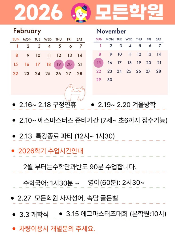 2월, 3월 삼성영어셀레나모든학원 2월 부터는 수학단과반도 90분 수업을 합니다. 학생들이 문제를 풀고 오답까지 정리하고 귀가합니다. 새학기 3월 부터는 수업시간을 새로 정비합니다. 구정 연휴 및 학원 방학 안내 2월 16일(일) ~ 18일(화) : 구정 명절 연휴 2월 19일(수) ~ 20일(목) : 학원 방학 에그마스터즈 대회 신청 안내 신청 기간 : 2월 10일(월)부터 대상 : 7세 ~ 초등 6학년 사자성어·속담 골든벨 일시 : 2월 27일(목) 내용 : 매일 공부하는 사자성어와 속담으로 골든벨 진행 → 가정에서도 의미와 쓰임을 함께 이야기하며 지도해 주시면 학습 효과가 큽니다. 개학 안내 3월 3일(화) : 개학식 방학 동안 아이들이 새 학기를 위해 열심....... <img src="https://blogthumb.pstatic.net/MjAyNjAyMDZfMjI2/MDAxNzcwMzI3OTcxOTk3.ACpJYHDBOuR8nOXRk-BSulKMtOjx7NfUBqtkgrgtAg0g.moCMBeHzAT6_xPZDZfqtwnfIFktV0cvzOSt0GKnaGKUg.JPEG/KakaoTalk_20260205_213303043.jpg?type=s3" />