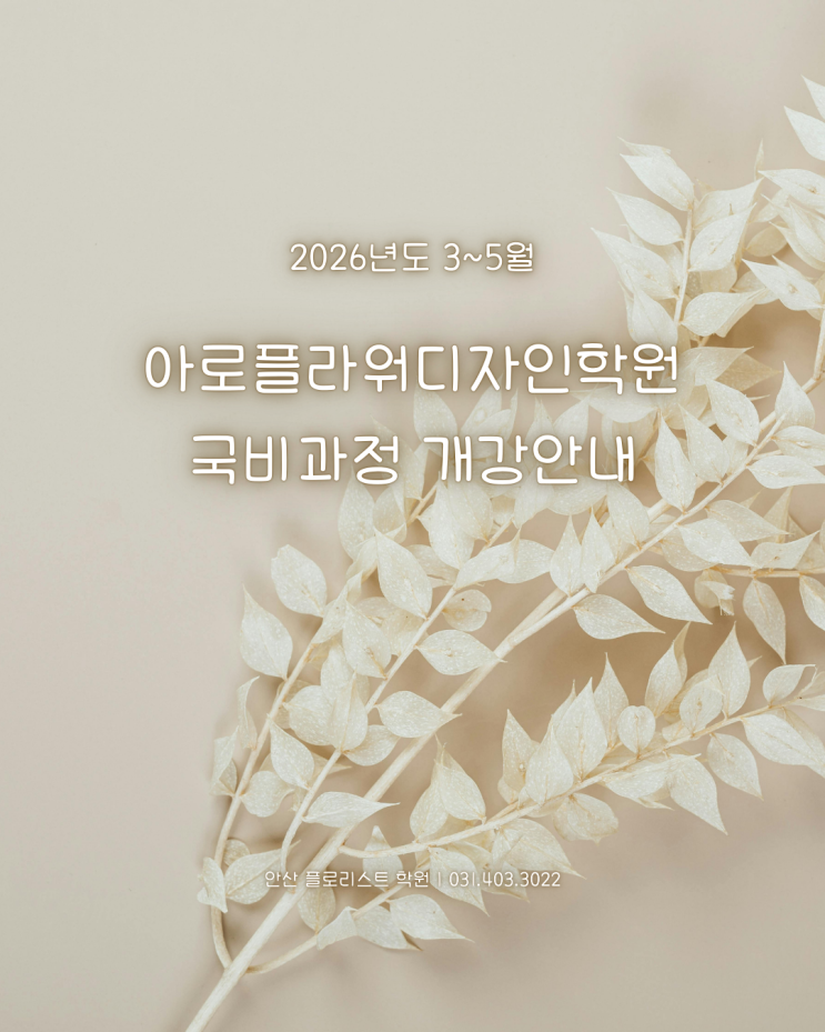 안녕하세요 안산 고잔동에 위치한 아로플라워디자인학원입니다 봄은 새로운 시작을 준비하는 계절이죠. 플로리스트 교육 문의가 가장 많이 집중되는 시기이기도 합니다. 창업을 준비하시는 분, 자격증 취득을 목표로 하시는 분, 취업을 위해 실무 중심 교육을 찾고 계신 분들까지— 수강생분들의 목표는 각기 다르지만, “제대로 배울 수 있는 과정”을 찾는다는 점은 같습니다. 아로플라워디자인학원은 2012년부터 국비지원 플로리스트 과정을 운영해온 직업훈련기관입니다. 기초 이론부터 시작해 매장 실무 상품 제작까지 단계적으로 배우며, 단순 작품 제작이 아닌 ✔ 현장에서 바로 활용 가능한 디자인 감각 ✔ 판매를 고려한 상품....... <img src="https://blogthumb.pstatic.net/MjAyNjAzMDRfMjA4/MDAxNzcyNjAwOTI1OTc2.lhU5uBPODhsxoqknMCpnXJpTgHTokxkBcBtR_Gt_iEAg.1b5ekb6P5HZ6IomeS1KrRO59twkdmnXpzSGekJlhdkIg.PNG/1.png?type=s3" />