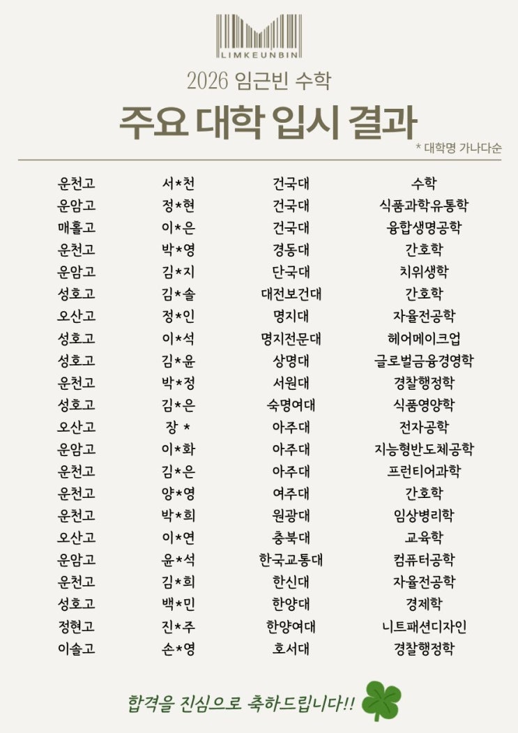 2026 대학 입학을 진심으로 축하드립니다. 그동안 정말 수고하셨습니다. <img src="https://blogthumb.pstatic.net/MjAyNjAyMDRfMTA0/MDAxNzcwMTc4NDI0MTMw.oYb1WChrjHorKG5twmF8rrMc-sWCUGjnNtQ6mfMF7K0g.jAkVkLWkznq--RrS26SGjufq58U6uCGpz3-3ksAcvN8g.JPEG/KakaoTalk_20260203_143325521.jpg?type=s3" />
