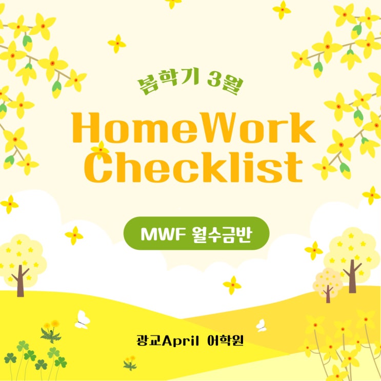 안녕하세요 학부모님 봄학기 A1 숙제체크리스트 전달드립니다. 학생들에게는 기존반에서 프린트로 출력하여 배부예정입니다 결석 혹은 분실로 인해 다시 출력을 원하시면 말씀해주세요 [월수금반 Phonics Starter] [월수금반 Seedbed A] [월수금반 Seed - Atrack반] [월수금반 Seed 1 - Btrack반] [월수금반 Sprout] [월수금반 Sapling] [월수금반 Junior Master] <img src="https://blogthumb.pstatic.net/MjAyNjAyMjBfMTA3/MDAxNzcxNTcwMzY1MTI3.xpGiyu2IxZTHvjYCjQWuynsaJrJo8VPMO_4NZfq_1fcg.Tybj67sDtAezhaPdCqoJqbo9eG5hy40Jun3J07UXGkcg.JPEG/%C1%A6%B8%F1%C0%BB-%C0%D4%B7%C2%C7%D8%C1%D6%BC%BC%BF%E4_-001_%286%29.jpg?type=s3" />
