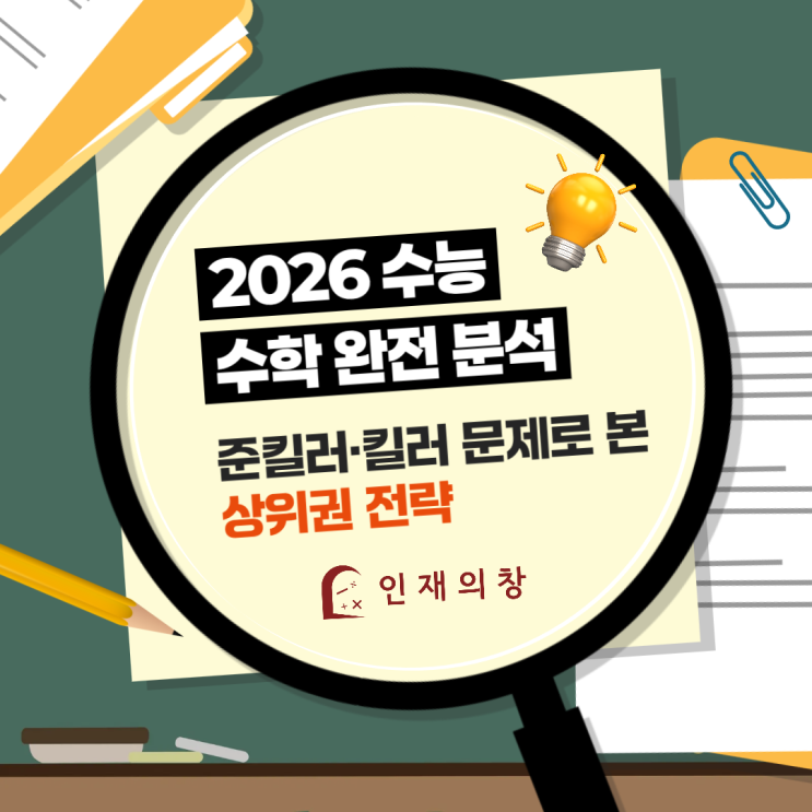 안녕하세요. 끝까지 관리하는 심화형 수과학학원 경기 고양시 일산동에 위치한 심화형 수학 과학 학원 인재의 창 입니다! 2026 수능, 모두 수고 많으셨습니다! 2026학년도 수능 수학은 단순 계산 능력만으로는 부족했습니다. 개념 이해와 문제 해결 능력, 그리고 시간 관리까지 동시에 요구하는 시험이었죠. 특히 공통과목은 안정적인 난이도 속에서도 사고력을 시험하는 문항이 많았고, 선택과목은 응용력이 상위권 변별의 핵심 역할을 했습니다. 오늘은 2026 수능 수학을 분석하고, 2027 수능에서 놓치지 않고 점수를 가져올 전략을 한눈에 정리해 드립니다. 출제 경향과 난이도 분석 2026학년도 수능 수학은 공통과목 중심의 안정적 난이도 속....... <img src="https://blogthumb.pstatic.net/MjAyNTEyMTJfMjQz/MDAxNzY1NTEyNDAxMTYy.V2qPEreRgsvZ-KLEYMipn_rxrkmYPMKHdfIBaT7Al1cg.JraaWcPomIfk4snqT0kpWur1M1u4No-3nCLK-ry6DOUg.PNG/%C0%FA%B5%BF%B0%ED_%BC%F6%C7%D0%C7%D0%BF%F8-001.png?type=s3" />