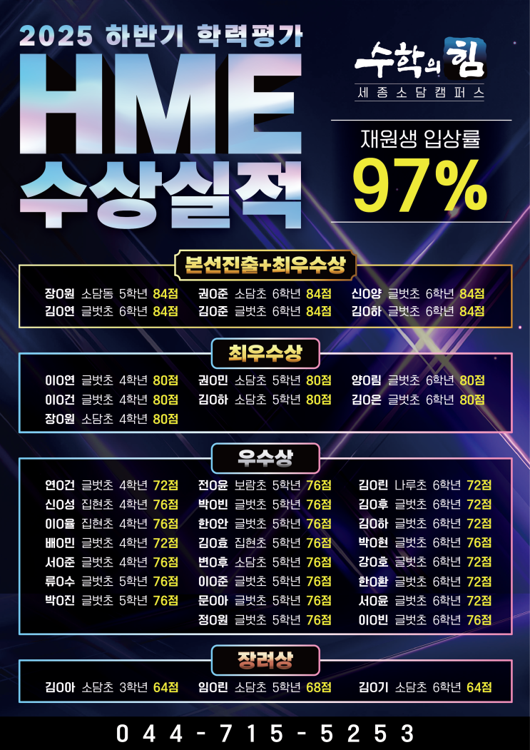 [수학의힘 세종소담캠퍼스] 2025 하반기 HME 학력평가 수상 안내