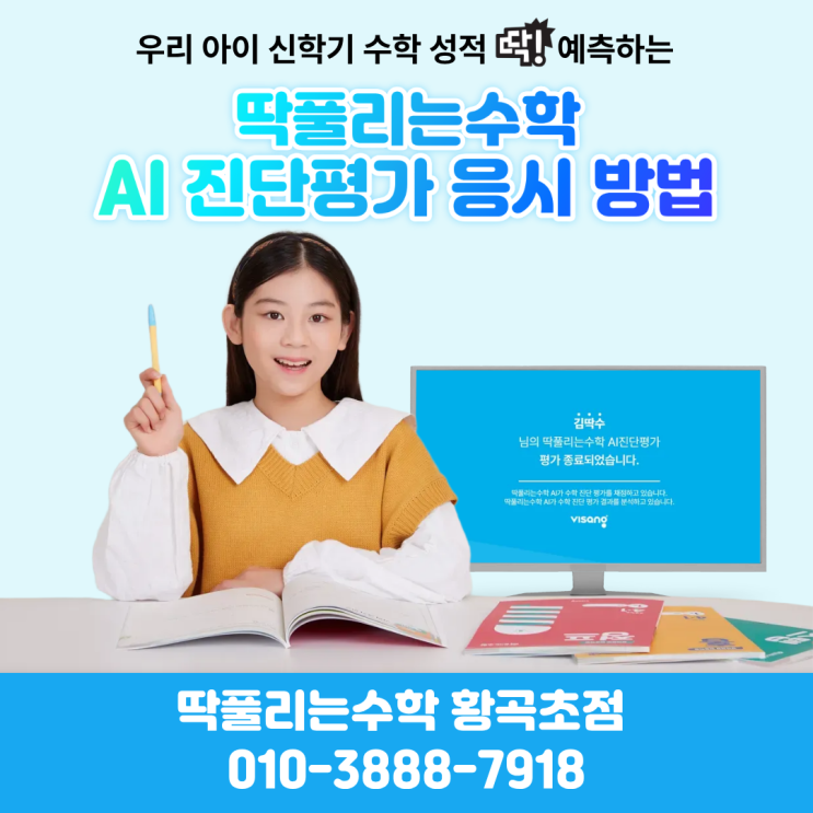 안녕하세요. 황곡초등학교 아이들의 실력이 쑥쑥 자라는 초등수학 전문학원 딱풀리는수학 황곡초점입니다! 11월 25일(화)부터 딱풀리는수학 AI 진단평가가 새롭게 오픈되었습니다. 다가오는 겨울방학을 앞두고, 우리 아이의 현재 수학 수준을 무료로 확인할 수 있는 특별한 기회인데요. 지금 학습 실력은 물론이고, 다음 학기 예상 성취도까지 미리 알아볼 수 있는 AI 진단평가! 어떻게 참여할 수 있는지 안내해 드릴게요. ✔️ 응시 방법 어렵지 않아요! 먼저 딱풀리는수학 공식 홈페이지에 들어가시면 가장 먼저 AI 진단평가 안내 팝업이 나타납니다. 여기서 ‘진단평가 응시하기’ 버튼을 눌러 주세요. 이후 몇 가지 기본 정보를 입력하시면 바....... <img src="https://blogthumb.pstatic.net/MjAyNTEyMTBfMzMg/MDAxNzY1MzMyOTMyMjgw.SDvJOMeNJ2WZLOygBzTKzmKCjoeK-QzDW2Rw0gAhFS8g.wwiIPuU044XFdg2PsqY06ODGSqcN9tqwXX-VFGssExQg.PNG/1.png?type=s3" />