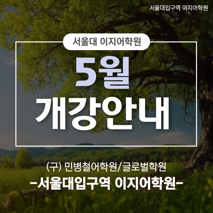 안녕하세요, 서울대입구역 이지어학원입니다 :) 어느덧 싱그러운 초록잎들이 짙어지는 계절인 5월이 다가오고 있습니다. 푸르름을 만끽하며 소중한 분들과 함께 하시는 즐겁고 행복한 5월 보내시기 바랍니다. ^^ 따스한 봄날, 어학 공부에 도전해보시는건 어떠세요?~ 오늘은 5월 학사 일정을 안내해드리겠습니다. 5월 학사일정입니다. 5월 4일은 매일반, 월수반, 월수금반 5월 7일은 화목반, 토익스피킹 화목반 5월 9일은 토요반 개강일입니다. 5/1(금),5/5(화),5/15(금),5/25(월),5/29(금)은 학원 휴강일입니다. * 5월 정규 프로그램 안내 * [회화 정규 과정] [토익 정규 과정] 서울대입구역 이지어학원 정규토익 과정은 초급/중급으로 운영되고....... <img src="https://blogthumb.pstatic.net/MjAyNjA0MTVfMTUz/MDAxNzc2MjQ3NDc5ODIw.VLqFf4LWNmAsiViGifHXwbzYEfJUzBJ8dfGb_qh1d5Eg.ipvB5pg0YGAGhc0oxfzeqQHrSnwuGl5uPPplQ6N-Fmwg.JPEG/5%BF%F9_%B0%B3%B0%AD%BE%C8%B3%BB.jpg?type=s3" />