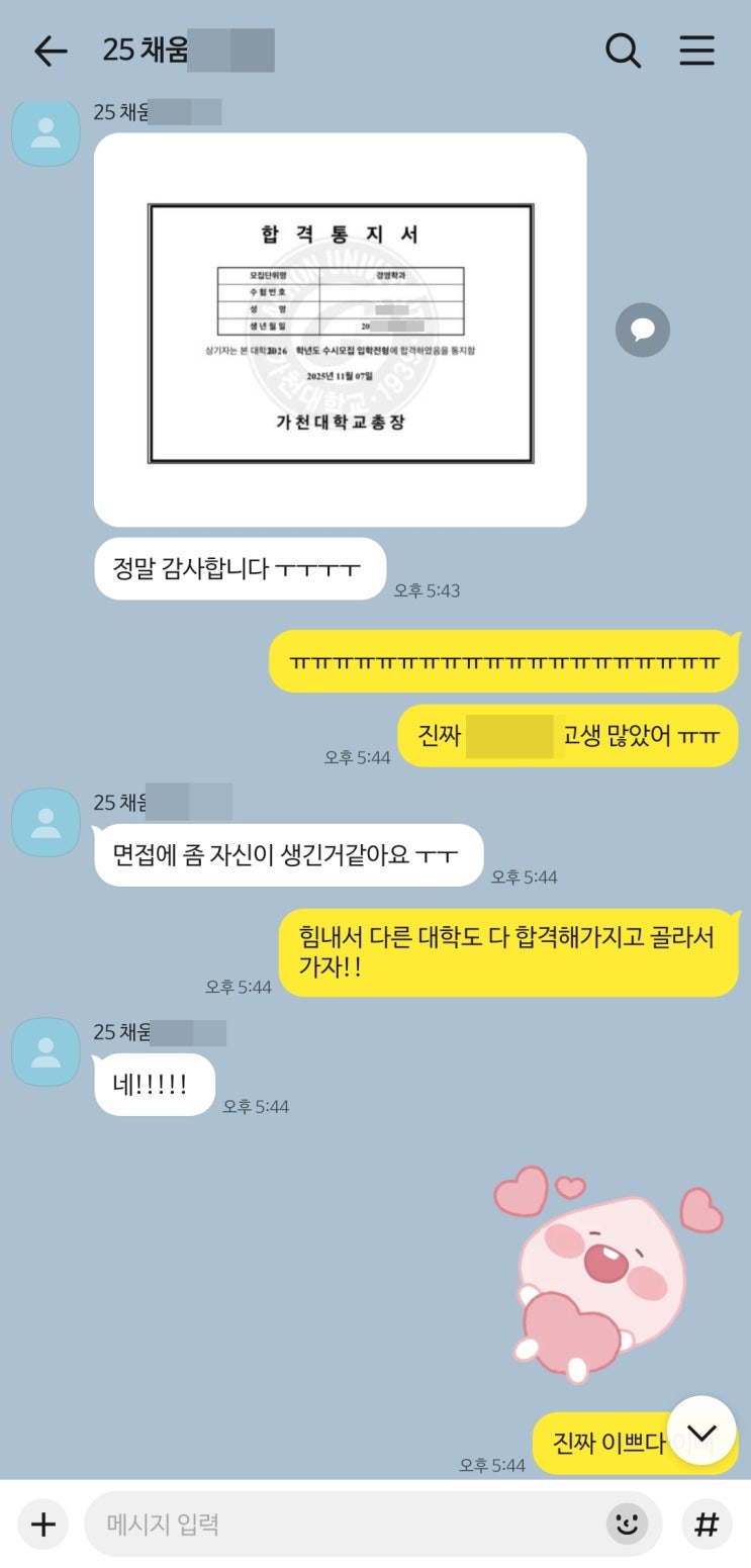 안녕하세요. 대입면접학원 채움스피치입니다~ 수시면접 준비로 정신없이 7~10월을 보내고, 이제는 수능을 목전에 둔 월요일입니다^^ 수능이 있는 한주는 그래도 조금 여유가 생기는 주에요. 하지만 수능이 끝나면 약 한달갈 몰아치는 수시면접으로 인해 또다시 굉장히 바쁜 한달을 보내게 되는데요. 학생부종합전형과 교과면접전형, 전문대학은 벌써 결과가 나온 곳들이 많아서 우선적으로 11/10 오늘 기준으로 합격현황을 잠시 포스팅하려 합니다. 벌써부터 합격소식이 여기저기서 들리니 뿌듯하네요. 올해도 역시 채움스피치는 합격생이 넘쳐날 것으로 보입니다~! 대부분의 주요대학들은 수능 이후 면접이 이루어지기 때문에 본격적인 합격소식....... <img src="https://blogthumb.pstatic.net/MjAyNTExMTBfMTY0/MDAxNzYyNzQwNDA3ODcz.hFLpGb47cLRLIy3MUDYbTalTADp-5nXlbb9LMVN_kgEg.x3h8uYq_oRo3ViQ1rvMI366o19e0JEHSXDnpI1yMfSEg.JPEG/%B0%A1%C3%B5%B4%EB_%B0%E6%BF%B5%C7%D0%B0%FA_%B3%B2%B1%C3%C0%B1_%282%29.jpg?type=s3" />