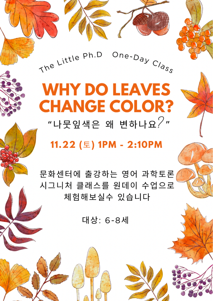 안녕하세요, 공부에 즐거움을 더해주는 더 리틀 피에이치디 입니다 ☺️ 이번 토요일 (22일) 더리피의 시그니쳐 영어 토론식 과학 수업 리서치 원데이 클래스를 진행 할 예정입니다. 더현대, 신세계로도 출강하는 인기 강좌인데요, 한달짜리 프로젝트 수업을 원데이로 체험해 보실 수 있습니다. 수업 주제: "나뭇잎 컬러는 왜 변하나요?" 대상: 6-8세 11.22일 토요일 1-2:10 PM 비용: 5만원 신청 및 문의사항은 카카오채널: littlephd ☎️032.254.0001 인스타그램 : #더리틀피에이치디 #송도학원 #송도원데이수업 #과학적사고 #영어토론 #프로젝트수업 #송도과학학원 #송도영어학원 #송도1공구학원 #송도문해....... <img src="https://blogthumb.pstatic.net/MjAyNTExMTlfMjY1/MDAxNzYzNTIyMDg2MDc5.BG53XgM7w_tC8hBn-8gF79lY_MNsVTUVjvK6qVZNCAYg.MG3nYm8KXUl-o9fRFkNSXgSnyQjMmsHDEiygXB893okg.PNG/900%A3%DF1763521133352.png?type=s3" />
