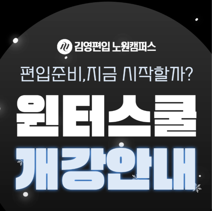 안녕하세요! 노원편입학원, 김영편입 노원캠퍼스입니다. ♂️ 2027학년도 상위권 대학 합격 전략, 언제부터 시작해야 할까요? 정답은 1-2월 윈터스쿨에서 기초를 완벽히 다지는 것입니다. 압도적인 합격 노하우와 최강 관리 시스템으로 무장한 노원캠퍼스의 윈터스쿨 개강 소식, 지금 바로 살펴 보러 가시죠! 합격으로 증명하는 노원캠퍼스 (강북/경기북부 최다합격) 편입의 시작은 검증된 결과에서 나와야 합니다. 김영편입 노원캠퍼스는 오직 성과로 그 실력을 입증합니다. 1,078건의 합격 신화는 단순히 많은 학생을 받은 결과가 아닌, 개개인의 실력을 상위권까지 끌어올린 노원캠퍼스만의 독보적인 관리와 커리큘럼의 결과입니다. ....... <img src="https://blogthumb.pstatic.net/MjAyNTEyMDRfNiAg/MDAxNzY0ODIxNTIzMzA4.leD2iZy6KVT7DKvyBZE94uwBtdyZFbWs8aHi6KhYLEEg.dlg9A9OQVmm4Dx2XCsiG2VjlIKsr5R45_7suHiuivOAg.PNG/image.png?type=s3" />