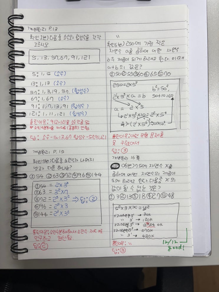 중학교 때 반 20등이 고등학교 1등급이 되었다? 반에서 20등, 시험은 반타작도 힘들었고, 고1 첫 중간고사 수학점수는 43점. 3월 모의고사 61점, 4등급. 누가 봐도 “수포자 직전”이죠. 그런데 고1 후반부에 1등급, 이후로 쭉 수능 1등급 유지, 수능 100분위는 100, 완벽한 점수. 어떻게 이런 변화가 가능했을까요? 터닝 포인트 여름방학이후 평촌 매쓰토리 수학학원을 찾은 아이에게 제시한 방법은 개념이 제일 중요하다고 이야기를 해주었습니다. 보통 아이들은 필기를 시키면, 쓰는데에 집중하느라 내가 왜?필기를 하고 활용을 하느데에 소홀해지기 마련입니다. 평촌 매쓰토리 수학학원에서는 개념을 정리하고 암기 시키고 복습을 시키면서 매 단계별로 확인 작업이 들어갑니다. 요새 아이들은 유투브나 짧은 틱톡등 눈으로만 공부 하려는 습관에 길들여져 있습니다. 공부라는 것 특히 수학은 눈으로 보고 손으로 써보고 입으로 중얼거리면서 하는 과목입니다. 1. 개념 완독 + 밑줄 + 요약 단순하게 그냥 읽는 것 쓰는 것이 아니라 개념 하나하나를 이해할 때까지 여러 번 읽고 중요한 이론에는 밑줄을 그어가면서 손으로 써보고 완전히 체득이 되어야 합니다. 호불호가 있지만, 수학은 기본적으로 함수가 가장 중요합니다. 그려가면서 이해를 해야 합니다. 그리고 자기나름대로 다시 요약하면서 스스로 질문하고 답하는 습관을 가져야 됩니다. 수학은 시간이 필요한 과목이고, 학원은 단순히 그 시간을 줄여주는 도구입니다. 2. 예제 → 유제 → 기본문제 반복 또 반복 문제풀이를 할 때는 예제부터 확실히 해결하고 다음 문제로 넘어가야 합니다. 채점을 할 때도 정답만 보는 것이 아니라, 풀이과정을 말로 설명해보면서 개념과 풀이방식을 체득해야 합니다. 평촌 매쓰토리수학은 아이들에게 항상 물어봅니다. “어떻게 풀었지?” 사실 90%의 아이들은 당황합니다. 한번도 학원을 다니면서 들어보지 못한 질문이라서요. 3. 교재를 풀 때 ,다양한 풀이법 익히기.. 학원에서 배운 것도 결국 개념으로 연결시켜 복습했고, “어디서 배웠는지”보다 “평촌수학학원 매쓰토리” 에서 어떤 원리로 설명되고 있는지’를 파악해야 합니다. 중,고등수학문제의 40%는 풀이법이 2개이상입니다. 4. 의문 생기면 다시 질문 이해 안 되는 부분은 “넘어가지 않고” 평촌수학학원 매쓰토리수학을 활용해서 완전히 이해할 때까지 붙잡고 매달려야 합니다. 평촌 수학학원 매쓰토리수학은 이해를 할때까지 무한 반복을 합니다. 5. 수학의 즐거움 발견 → 몰입의 동력 처음엔 억지로 하던 수학이 점점 “이해 → 문제 해결 → 성취 → 재미” 로 이어지면서 수학에 빠져들게 되는 시점이 옵니다. 다시 한번 수학은 시간이 필요한 과목입니다. 1학기성적이 안좋아서 2학기 성적이 안좋아서 겨울 방학때 앞단원부터 다시 한다고 열의에 불타오르게 되면, 결국 3월 개학이오면 1단원만의 신이 됩니다. 그런, 우메한 짓은 하지말기를 바랍니다. 겨울방학은 새로운 학기의 예습이 되어야 합니다. 공부를 하면서 전단원이 부족하다면, 평촌 매쓰토리 수학학원에서 부족한 부분을 채우면 됩니다. 설마? 생각하지 말고, 시도해보지 않으면 모릅니다. 성취감을 정말 강하게 느낄 수 있는 과목이 수학이라는 것을요. 어려운 만큼, 해냈을 때의 보람과 충족감은 이루 말할 수 없거든요. 부모님께 드리는 제안 아이가 수학을 어려워한다면, 문제집만 넘기지 말고 개념부터부터 정리하고 암기하게 해주세요.시간을 줄이고 싶다면 평촌 매쓰토리수학학원으로 보내주세요. 특히 고등학교 입학 직전이거나 고1이라면, 지금이 ‘공부법을 바로잡을 수 있는 골든타임’입니다. 수학은 해보지도 않고 '안되겠어...' 라고 포기하는 아이들이 정말 많습니다. 공부법을 몰라서 못하는 경우다 대다수입니다. 일단 시작해보세요. 그러면 평촌 수학학원 매쓰토리가 왜 확신을 가지고 추천하는지 알게 됩니다. 누구나 다 아는 말이지만, 실천하지는 않는 것. 수학 공부의 답은 가장 가까운 곳에 있을지도 모릅니다. 약력 전)송파 제일영재학원(고등부 팀장) 전)송파 대성학원(고등부) 전)부천 대성학원본원(고등부/재수반) 전)인천 대성학원본원(고등부/재수반) 전)평촌 필탑학원(고등부 팀장) 현)평촌 매쓰토리 수학학원 평촌본관원장 현)자이스토리 검수위원 현)이투스북(고쟁이) 연간검토위원