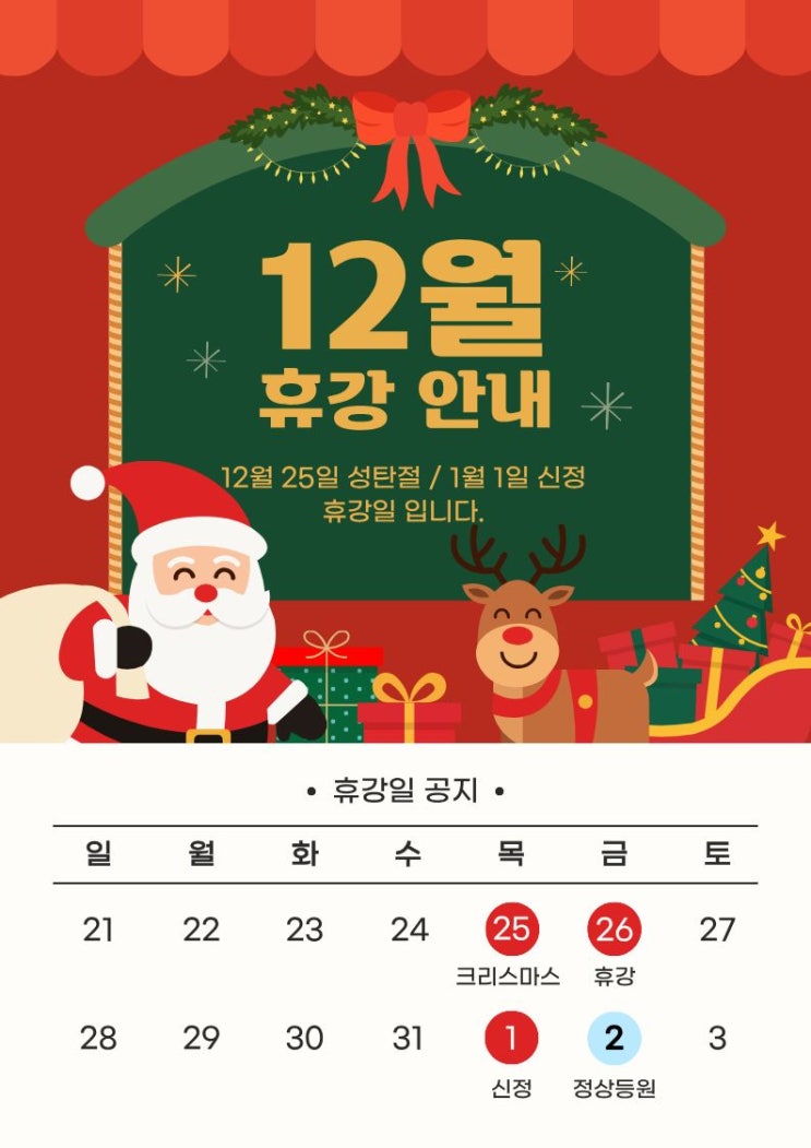 안녕하세요. 폴라나어학원 정자점 입니다. 2025년 12월 휴강일 안내 드립니다. 다른 문의사항은 카카오톡 채널 1:1 채팅이나 원으로 전화 주시면 친절하게 상담 도와드리겠습니다. ▶ 카카오 채널 채팅 <img src="https://blogthumb.pstatic.net/MjAyNTEyMTBfMTAg/MDAxNzY1MzM5NTkyODc4.cCu5gOwBtdg-KFcquB3W2mMD2SGTyX9cx1OywL8xNqYg.BcZ-iDWCltgeLigE2UPi6PRJYwtVn4pI3M-Y2GktoI4g.JPEG/25%B3%E2_12%BF%F9_%C8%DE%B0%AD.jpg?type=s3" />