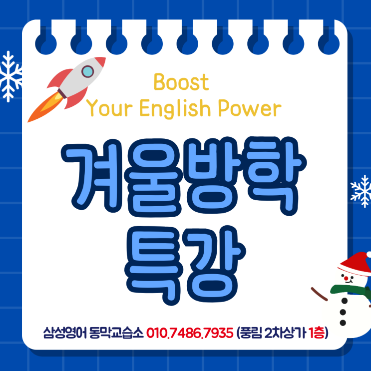 방학을 보내는 두 가지 방법! 흘려 보내기 vs 실력 쌓기 여러분의 선택은 무엇인가요? 겨울방학은 영어 실력을 한 단계 Jump Up 할 수 있는 결정적인 시간입니다. 동춘동삼성영어동막교습소의 2026 겨울방학 특강 프로그램을 안내해드립니다. ♥ 1.5배 학습 정규수업 후 30분 추가 수업으로 빠르게 진도를 나갑니다. ☆ 영어학습을 늦게 시작했거나 빠르게 성장하고 싶은 학생들에게 추천합니다. ♥ Grammar 101 초/ 중등 필수 문법을 정리하고 시험 영어를 대비합니다. ☆ 문법 A: 초4 또는 Basic 3 이상 문법 B: 초 5 또는 Basic 6 이상 문법 S: 중등 또는 Inter 이상에게 추천합니다. ♥ 기초 리딩 영미 문화가 담긴 헤이즐 리딩 교재로 즐거....... <img src="https://blogthumb.pstatic.net/MjAyNTEyMTZfMjIw/MDAxNzY1ODE4MjQyMTc2.9_L6COnDVsgORSqxkTnU0F3gJEdTD6y0kwCpYpacGKAg.4LVN-giUUnZiePrPCKN4z9bJHb-7fq3aIeJXYwgId0wg.PNG/3.png?type=s3" />