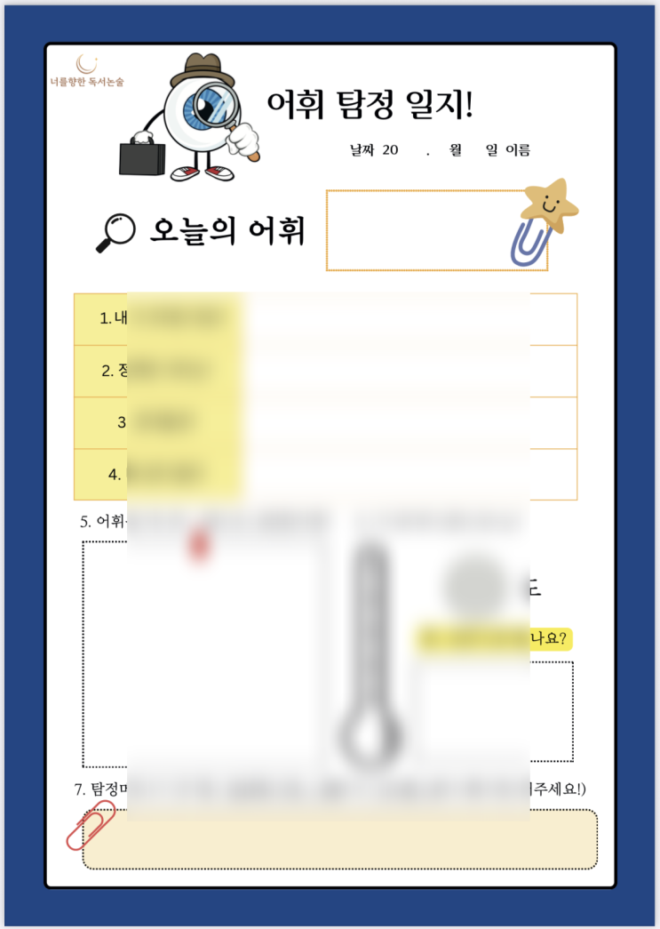 안녕하세요. ^^ 오늘은 12월부터 새롭게 시작한 어휘 수업을 소개해 드리려고 합니다. 요즘 아이들의 문해력 부족 원인을 이야기할 때 빠지지 않는 요소가 바로 어휘력인데요. 어휘는 원래 책을 통해 자연스럽게 쌓이는 것이 가장 좋지만, 요즘은 미디어가 너무 넘쳐나고, 구어체 표현이 많은 만화책 위주의 독서가 익숙한 아이들이 많다 보니 어휘력이 부족한 학생들이 점점 늘어나고 있는 것이 현실입니다. 어휘 공부는, 책 속에서 다양한 어휘를 만나고, 문맥 속에서 의미를 이해하며 자연스럽게 언어 감각을 키우는 경험이 중요합니다. 그래서 고민했습니다. “어떻게 하면 아이들이 억지 암기가 아닌, 진짜 ‘감각’으로 어휘를 익힐 수 있....... <img src="https://blogthumb.pstatic.net/MjAyNTEyMDRfNTkg/MDAxNzY0ODM4NTUyOTEy.27wTDTuym7Tl_OPnKTLz9E-yYFtJC_liaPP5HkCC3jUg.DH6WenItY5XER36R1SMfxSaL8rrG_bJINkcA2QeSpNAg.PNG/image.png?type=s3" />