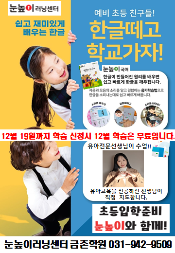 눈높이 금촌 학원 유아반 소개 아이들의 첫 학습 경험은 앞으로의 성장에 중요한 밑거름이 됩니다. 눈높이 금촌 학원 유아반은 연령 발달 단계에 맞춘 체계적인 커리큘럼으로, 아이들이 즐겁게 배우면서도 집중력과 기초 학습 능력을 자연스럽게 키워갈 수 있도록 설계되었습니다. 아이들의 첫 배움, 전문성과 따뜻함이 함께하는 금촌 학원 유아반에서 시작해 보세요. 금촌학원 유아반에서는 5-7세 까지 시간대별로 다양한 아이들이 와서 학습을 진행하게 됩니다! 눈높이 금촌 학원 유아반 한글 학습 과정 금촌학원 유아반에서는 아이들의 눈높이에 맞춰 한글 학습을 단계별로 체계적으로 진행합니다. 1. 통글자 학습 처음에....... <img src="https://blogthumb.pstatic.net/MjAyNTEyMDlfMTA1/MDAxNzY1MjY2MTY2Mjk0.L83VtDKcet2vGc1UQNYwBPvhLzY2OFDQ710GXwtG_1kg.IhwTLux2b1AzJJedJCnrl3BYBHAwisngQDFq_DMIP48g.PNG/1765266146351.png?type=s3" />
