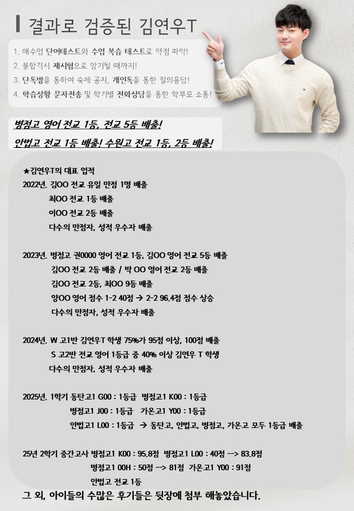 중학교 때 반 20등이 고등학교 1등급이 되었다? 반에서 20등, 시험은 반타작도 힘들었고, 고1 첫 중간고사 수학점수는 43점. 3월 모의고사 61점, 4등급. 누가 봐도 “수포자 직전”이죠. 그런데 고1 후반부에 1등급, 이후로 쭉 수능 1등급 유지, 수능 100분위는 100, 완벽한 점수. 어떻게 이런 변화가 가능했을까요? 터닝 포인트 여름방학이후 평촌 매쓰토리 수학학원을 찾은 아이에게 제시한 방법은 개념이 제일 중요하다고 이야기를 해주었습니다. 보통 아이들은 필기를 시키면, 쓰는데에 집중하느라 내가 왜?필기를 하고 활용을 하느데에 소홀해지기 마련입니다. 평촌 매쓰토리 수학학원에서는 개념을 정리하고 암기 시키고 복습을 시키면서 매 단계별로 확인 작업이 들어갑니다. 요새 아이들은 유투브나 짧은 틱톡등 눈으로만 공부 하려는 습관에 길들여져 있습니다. 공부라는 것 특히 수학은 눈으로 보고 손으로 써보고 입으로 중얼거리면서 하는 과목입니다. 1. 개념 완독 + 밑줄 + 요약 단순하게 그냥 읽는 것 쓰는 것이 아니라 개념 하나하나를 이해할 때까지 여러 번 읽고 중요한 이론에는 밑줄을 그어가면서 손으로 써보고 완전히 체득이 되어야 합니다. 호불호가 있지만, 수학은 기본적으로 함수가 가장 중요합니다. 그려가면서 이해를 해야 합니다. 그리고 자기나름대로 다시 요약하면서 스스로 질문하고 답하는 습관을 가져야 됩니다. 수학은 시간이 필요한 과목이고, 학원은 단순히 그 시간을 줄여주는 도구입니다. 2. 예제 → 유제 → 기본문제 반복 또 반복 문제풀이를 할 때는 예제부터 확실히 해결하고 다음 문제로 넘어가야 합니다. 채점을 할 때도 정답만 보는 것이 아니라, 풀이과정을 말로 설명해보면서 개념과 풀이방식을 체득해야 합니다. 평촌 매쓰토리수학은 아이들에게 항상 물어봅니다. “어떻게 풀었지?” 사실 90%의 아이들은 당황합니다. 한번도 학원을 다니면서 들어보지 못한 질문이라서요. 3. 교재를 풀 때 ,다양한 풀이법 익히기.. 학원에서 배운 것도 결국 개념으로 연결시켜 복습했고, “어디서 배웠는지”보다 “평촌수학학원 매쓰토리” 에서 어떤 원리로 설명되고 있는지’를 파악해야 합니다. 중,고등수학문제의 40%는 풀이법이 2개이상입니다. 4. 의문 생기면 다시 질문 이해 안 되는 부분은 “넘어가지 않고” 평촌수학학원 매쓰토리수학을 활용해서 완전히 이해할 때까지 붙잡고 매달려야 합니다. 평촌 수학학원 매쓰토리수학은 이해를 할때까지 무한 반복을 합니다. 5. 수학의 즐거움 발견 → 몰입의 동력 처음엔 억지로 하던 수학이 점점 “이해 → 문제 해결 → 성취 → 재미” 로 이어지면서 수학에 빠져들게 되는 시점이 옵니다. 다시 한번 수학은 시간이 필요한 과목입니다. 1학기성적이 안좋아서 2학기 성적이 안좋아서 겨울 방학때 앞단원부터 다시 한다고 열의에 불타오르게 되면, 결국 3월 개학이오면 1단원만의 신이 됩니다. 그런, 우메한 짓은 하지말기를 바랍니다. 겨울방학은 새로운 학기의 예습이 되어야 합니다. 공부를 하면서 전단원이 부족하다면, 평촌 매쓰토리 수학학원에서 부족한 부분을 채우면 됩니다. 설마? 생각하지 말고, 시도해보지 않으면 모릅니다. 성취감을 정말 강하게 느낄 수 있는 과목이 수학이라는 것을요. 어려운 만큼, 해냈을 때의 보람과 충족감은 이루 말할 수 없거든요. 부모님께 드리는 제안 아이가 수학을 어려워한다면, 문제집만 넘기지 말고 개념부터부터 정리하고 암기하게 해주세요.시간을 줄이고 싶다면 평촌 매쓰토리수학학원으로 보내주세요. 특히 고등학교 입학 직전이거나 고1이라면, 지금이 ‘공부법을 바로잡을 수 있는 골든타임’입니다. 수학은 해보지도 않고 '안되겠어...' 라고 포기하는 아이들이 정말 많습니다. 공부법을 몰라서 못하는 경우다 대다수입니다. 일단 시작해보세요. 그러면 평촌 수학학원 매쓰토리가 왜 확신을 가지고 추천하는지 알게 됩니다. 누구나 다 아는 말이지만, 실천하지는 않는 것. 수학 공부의 답은 가장 가까운 곳에 있을지도 모릅니다. 약력 전)송파 제일영재학원(고등부 팀장) 전)송파 대성학원(고등부) 전)부천 대성학원본원(고등부/재수반) 전)인천 대성학원본원(고등부/재수반) 전)평촌 필탑학원(고등부 팀장) 현)평촌 매쓰토리 수학학원 평촌본관원장 현)자이스토리 검수위원 현)이투스북(고쟁이) 연간검토위원