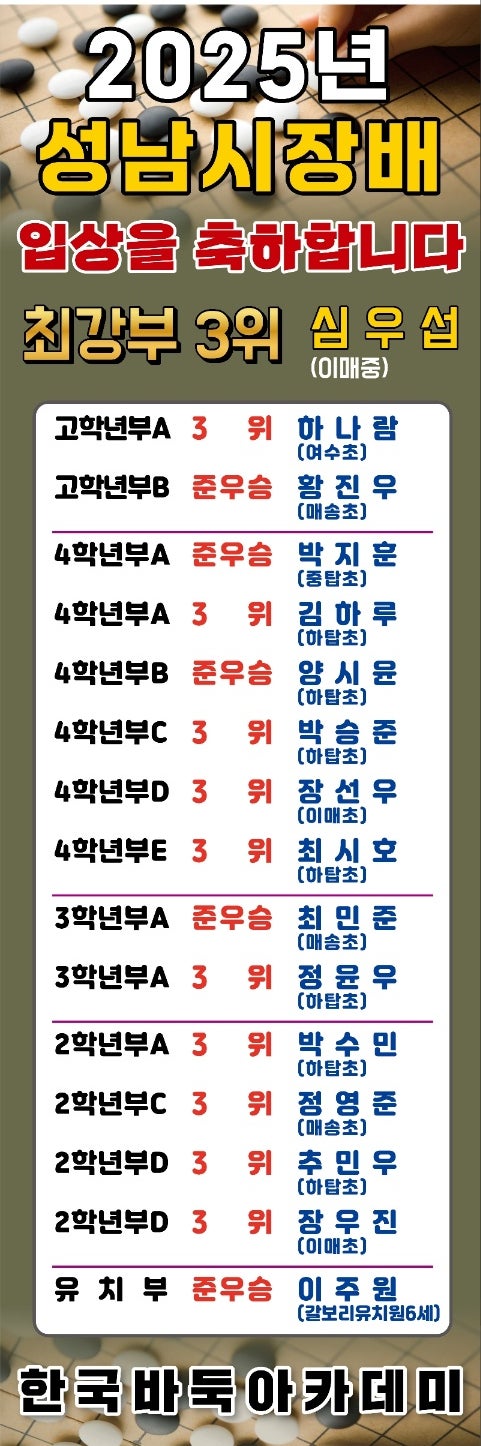 한국바둑아카데미학원 입상을 진심으로 축하드립니다! <img src="https://blogthumb.pstatic.net/MjAyNTExMjFfMjEw/MDAxNzYzNzA1NzIzOTg1.ZxoKanXkCibfroCzS-vmdMCyXbE9gn5ff5yHAaROBQQg.EBlPgQxoJtmjJYeJ_pWzUOzFMyBr60Ih0IQUOlQALQIg.JPEG/1..jpg?type=s3" />