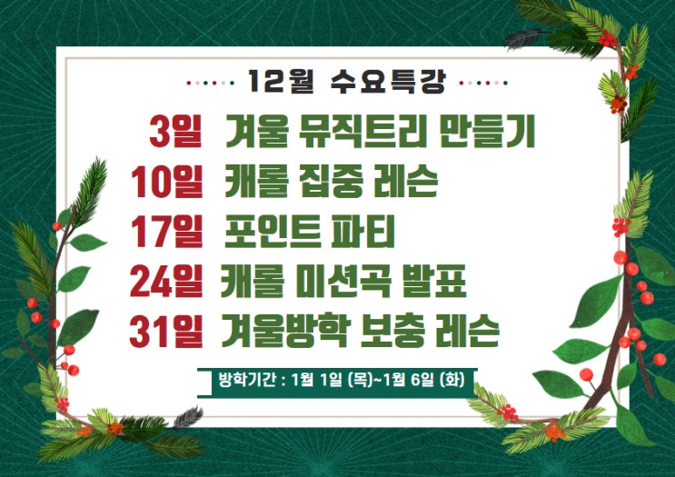 12월 수요특강 안내 제이 줄리어드의 12월은 배움과 즐거움이 함께하는 따뜻한 겨울 준비로 가득합니다. 12월 수요특강 일정 3일 겨울 뮤직트리 만들기 10일 캐롤 집중 레슨 17일 포인트 파티 24일 캐롤 미션곡 발표 31일 겨울방학 보충 레슨 아이들이 기다리는 수요일, 재미있고 의미 있는 음악 시간으로 채워질 예정입니다. 많은 기대 부탁드려요 <제이 줄리어드 겨울방학 안내> 1월1일(목요일)~1월 6일 (화요일) 따뜻하고 건강한 겨울 보내고, 방학 후 더 반짝이는 모습으로 만나겠습니다 #제이줄리어드피아노학원 #삼송초피아노학원 #원흥동피아노학원 #피아노배우기 #피아노레슨 #피아노수업 #콩쿨준비 #2층....... <img src="https://blogthumb.pstatic.net/MjAyNTEyMDZfODkg/MDAxNzY1MDA2MDQ3NTY1.w7qLG8pQw2rxzWengT7cXHQxs8NR2nU9braIMjjslO8g.aM0RmZeoUZ4PpJ0M6LEAT3dAb1-dTcujpXdKRJjhcUcg.JPEG/12%BF%F9_%BC%F6%BF%E4%C6%AF%B0%AD_%BE%C8%B3%BB_.jpg?type=s3" />