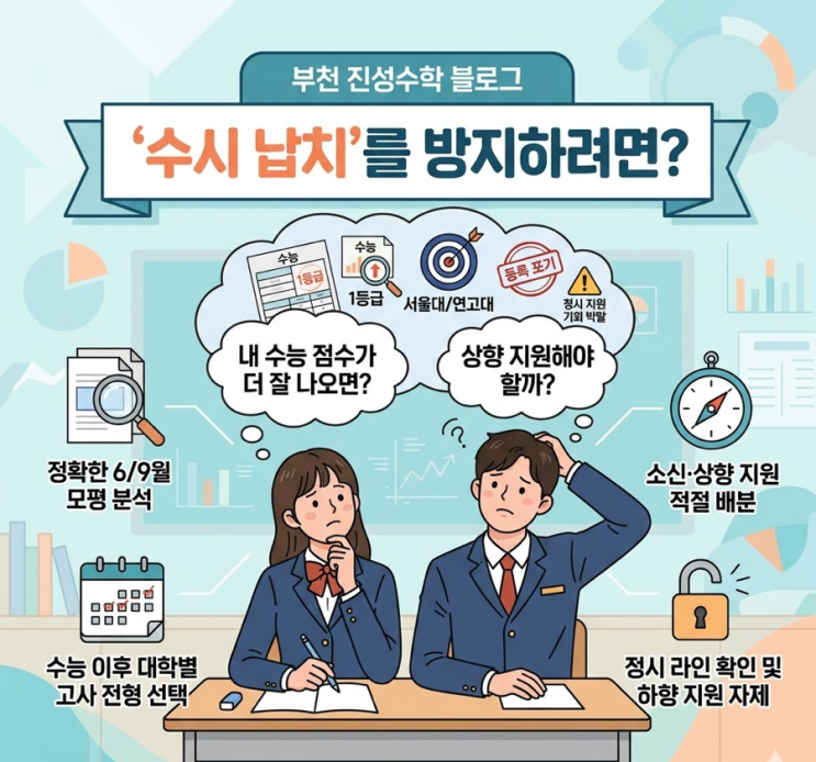 안녕하세요, 부천 진성수학 학원입니다. 얼마전에 학원이 '중앙대학교 수능 케어' 무산 이슈로 떠들썩 했었어요. 중앙대가 지난 입학전형 설명회에서 "수시에 합격하더라도 본인이 원하면 합격을 포기하고 정시에 지원할 수 있게 하겠다"는 파격적인 제도를 발표했었는데, 그게 무산된 것이죠. 수능 성적이 기대보다 너무 잘 나와서 더 상위권 대학에 정시로 갈 수 있는데, 이미 수시에서 합격해버려서 발이 묶이는 일명 '수시 납치'를 방지하겠다는 의도로 내놓은 제도인데, 현행법을 피해 서류 미비 등을 이유로 인위적으로 불합격 처리를 하는 방식으로 정시 지원이 가능하도록 하겠다는 내용이었지만 교육부의....... <img src="https://blogthumb.pstatic.net/MjAyNjA0MTRfNjIg/MDAxNzc2MTQzMTEzNTgw.1Nwp0Mt8ca9lFZ69AdzygdALq1a91HSaSqNQIS_Q01og.R_DEaoK1A_Ze3Ct7bRYHnhULceo-N4SVTzEWttQk0BEg.PNG/%BD%BA%C5%A9%B8%B0%BC%A6_2026-04-14_%BF%C0%C8%C4_2.04.50.png?type=s3" />