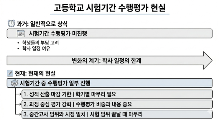 #부천 #상동 #국영수 #생기부 #1대1 #컨설팅 #뱅뱅프라자 #특목고 #자사고 #일반고 #수행평가 #독서 #논술 #수시 #석천 #상일 #부명 #상원 #중흥 #중원 #원미 #계남 #수주 #정명 고등학교의 시험기간의 수행평가 현실 일반적으로 시험기간에는 수행평가가 진행되지 않는것이 상식이었습니다. 선생님들도 학생들의 심리적, 실제적 부담에 대해서 잘 알고 계시고, 학사 일정에서도 그렇게 무리 할 이유가 없었기 때문입니다. 현재는 학사일정의 한계로 시험기간에도 수행평가가 일부 진행되고있습니다. 1.성적산출마감기한이 학기별로 마무리되어야하고 2.과정중심 평가의 강화로 수행평가의 비중과 내용이 중요해졌으며 3.중간고사범위가 끝날때쯤....... <img src="https://blogthumb.pstatic.net/MjAyNjA0MTZfMjQw/MDAxNzc2MzM5MjY5MzI1.Hrkk2LNWXeq6SfvZ-Pw8rXr_aKMAqKwDEnYdXed2bCcg.5dVouL5T4RYe5EyEp2AJpsu5qLuWKL0VwWMul9qfDREg.PNG/image.png?type=s3" />