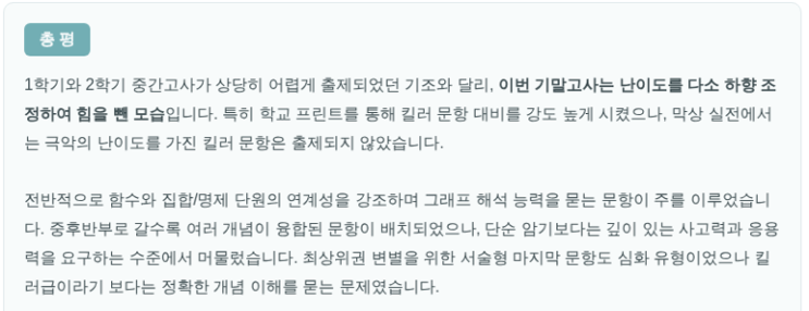 2025 영훈고 1학년 2학기 기말고사 총평 ■ 이전시험들에 비해 난이도가 평이하게가 조정되었으나 여전히 실수유발하는 함정은 존재 ■ 유리/무리함수의 그래프를 정확히 그려 직선과의 위치관계를 파악하거나, 도형 내부의 점 개수를 세는 문제가 등급을 가르는 핵심 변별력으로 작용. ■ 학교프린트의 킬러문항 보다는 교과 개념의 정확한 활용과 그래프 추론 능력이 더 중요했던 시험 ● 등급별 대비 사항 이번 시험은 함수의 그래프 개형을 얼마나 빠르고 정확하게 그릴 수 있느냐가 시간관리와 고득점의 열쇠였습니다. ■ 학부모님께 드리는 글 고등학교 1학년의 마지막 시험인 2학기 기말고사는 수능 수학의 기초가 되는 '함수'를....... <img src="https://blogthumb.pstatic.net/MjAyNTEyMTFfODcg/MDAxNzY1NDI0NDc5OTM2.NQGtGRx6LvgVXX0gwu1yPqaXtSdoAu6obwG4ZYRsHy4g.CpdgkiM3Kt-hv216cpvYDdo2ylVuzkXONms5Cq758-8g.PNG/image.png?type=s3" />