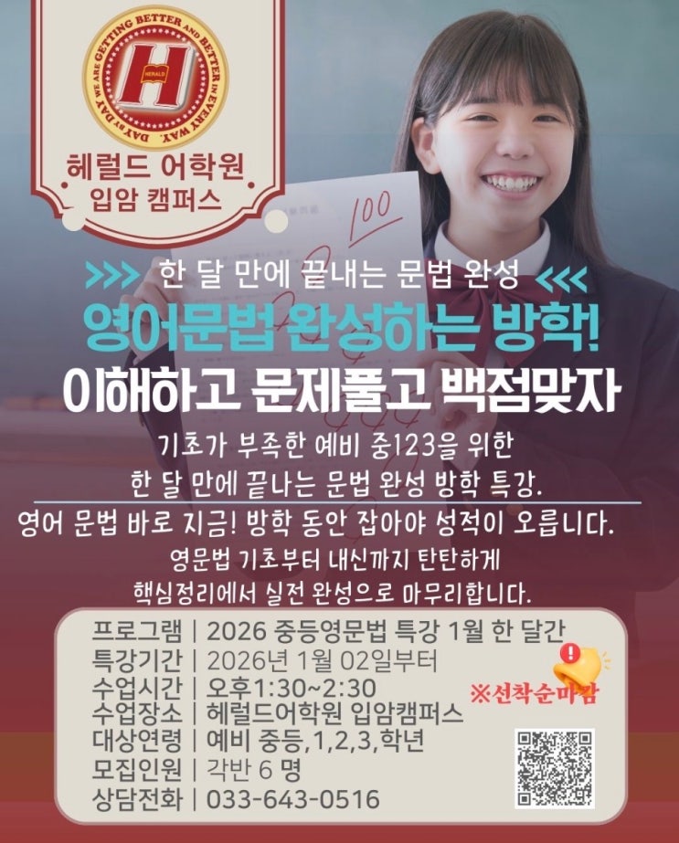 안녕하세요~ 강릉 헤럴드 어학원입니다 이번 글에서는 헤럴드 어학원 입암캠퍼스에서 진행하는 겨울방학 특강에 대해서 알려드리려고 합니다 겨울방학은 평소 놓친 부분을 보완하고, 다음 학기 실력을 크게 끌어올릴 수 있는 가장 결정적인 시기입니다. 헤럴드어학원 입암캠퍼스에서는 이번 방학 동안 두 가지 핵심 프로그램을 집중 운영하여, 학생들이 새 학년을 더 단단하게 준비할 수 있도록 돕고자 합니다. 예비 중1·2·3 학생들이 가장 많이 고민하는 영역이 바로 ‘문법’입니다. 문법 개념을 제대로 이해하지 못한 상태에 학교 진도가 시작되면, 독해·내신·서술형까지 연쇄적으로 어려움을 겪게 됩니다. 이번 겨울방학에는 필요한 개념만 빠....... <img src="https://blogthumb.pstatic.net/MjAyNTEyMDJfMTMy/MDAxNzY0NjU1MzI5NjY2.kogyUgeX151M19bOIkgI-HC9MlM9rzBAaKN4sM7eL4kg.LrGu9hVnSBkjFxpoM500hoPftbrWJrxwT1uwvcBbxCgg.JPEG/KakaoTalk_20251128_132916823.jpg?type=s3" />