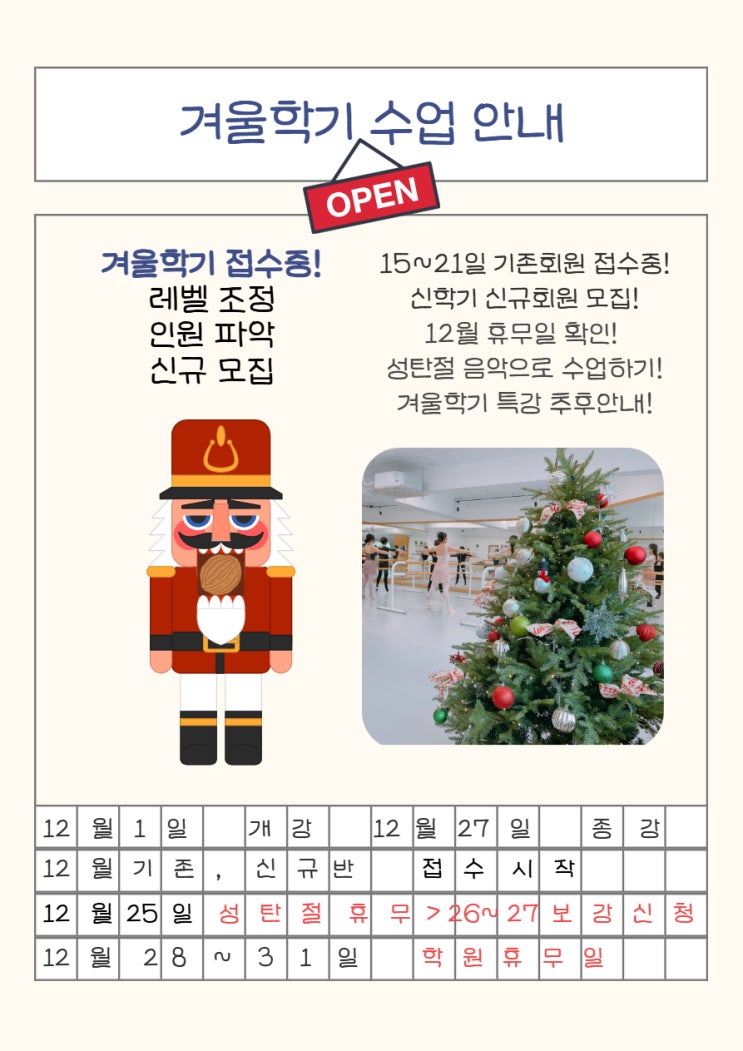 2025년 겨울학기 시간표 안내드립니다!! 준발레 3번째홀이 10월에 완공되면서 11월부터 수업이 시작되었습니다. 12월부터 진행하는 신학기 겨울학기에는 더 좋은 공간에서 발레를 해보세요~ ^^ 12월부터 진행하는 시간표 안내드립니다. 2025년 12월부터 시작하는 겨울학기는 2026년 새해 2월까지 진행됩니다. 11월부터 반을 모집하여 정원마감이 되면 나머지 2차 모집은 12월에 한번 더 진행을 합니다. 겨울학기에 모집하는 반이 많지는 않아서 못하시는 경우 2026년 봄학기에 많은 분들이 할 수있도록 노력하겠습니다. < 겨울학기 모집하는 반 > <img src="https://blogthumb.pstatic.net/MjAyNTExMjVfMjEx/MDAxNzY0MDAxMTA2NTM0.MXauWXwk_AzE5Zm8WQsUSPyTOcu0YjgF4dzkSLrmEn8g.EH-EaXXZ0MK6-ut-_Qofl10eiwbRb5_14NUOL-D1Figg.JPEG/%BC%F6%BE%F7%BE%C8%B3%BB_%B8%E0%C6%AE_%2821%29.jpg?type=s3" />