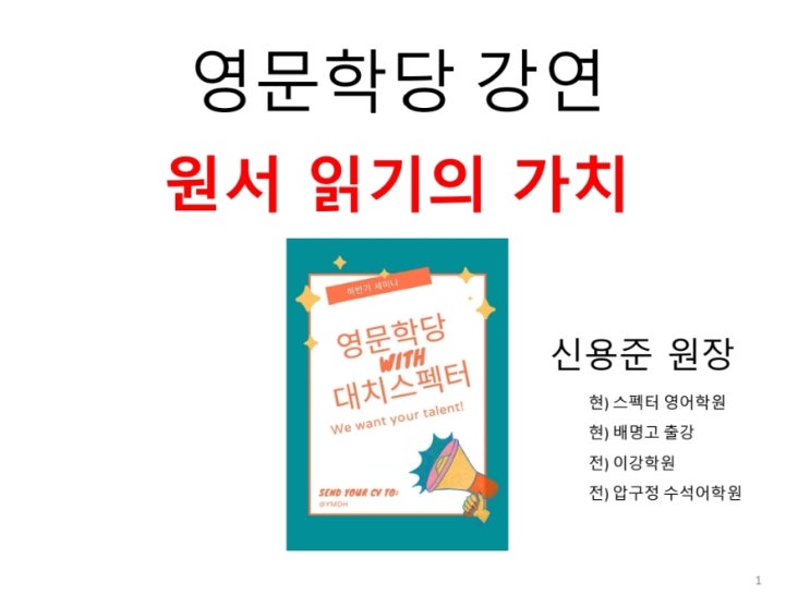 안녕하세요 정강영어 오정하입니다. 저는 저번주 영문학당 2025년 하반기 세미나에 처음 참석했습니다. 제가 쓰레드에서 눈여겨보던 대치스펙터 원장님이 강연을 해주셔서 더더욱 뜻깊은 세미나였습니다. (영문학당은 인스타에서 / 대치스펙터는 쓰레드에서 유명합니다^^) 직접 중고등 내신과 수능을 압구정, 대치동에서 20년간 가르치시던 분의 원서의 가치에 대한 역설은 이미 원서를 제대로 가르치시는 선생님들에게 안도감과 자랑스러움을 안겨주었습니다. 제 글보다는 대치동 신용준 원장님의 발표자료를 직접 보시는 것이 훨씬 도움이 되실 것 같아서 준비했습니다. 저는 정말 한글, 영어 독서를 강조하는 사람으로서 우리 학생들이 이 AI ....... <img src="https://blogthumb.pstatic.net/MjAyNTEyMTNfNzMg/MDAxNzY1NjAyMDcxNjYx.479J4EO6FFxl2NkQlqhKZ23OxzQGh7Cv3LwAgWEIwY0g.FrvLXgy42ssRQHnktgDch_ahNI1DfkpSmXIpaVhgY24g.JPEG/900%A3%DF1765086159009.jpg?type=s3" />