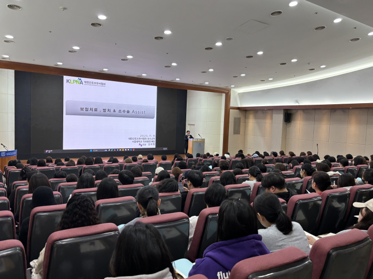 2025년 11월 16일 일요일 오후에 서울대학교 치과병원 8층 대강당에서 간호조무사 보수교육이 진행되었습니다. 이번 보수교육에서는 간호조무사 치의학 필수보수교육으로 4시간 동안 진행이 되었는데 200여분이 넘는 많은 분들이 참여하셔서 대강당을 가득 메워 주셨네요. 1,2 교시에는 치과 보철치료 어시스트와, 발치 및 소수술에 대한 내용을 엔플러스 간호학원 경영원장인 제가 직접 강의를 진행 했고, 3,4교시에는 임플란트 수술 어시스트에 대한 주제로 김성훈 원장님께서 강의를 맡아주셨습니다. 이날 한국보건복지인재원의 신성장사업실 품질인증사업팀에 계시는 대리님과 주임님도 보수교육 시간 내내 함께 해주시고 강의 후 이야기도 함....... <img src="https://blogthumb.pstatic.net/MjAyNTExMjVfOTUg/MDAxNzY0MDQ2OTU1NzQ4.KlkQfFpbfhaqVyfOaJc9u9WQ20hFj6CABcPLDRftI4Ig.7AEJy7pKMANtnBKpb8Q_fauQ6ksGmGB15NKkBnh_o9kg.PNG/image.png?type=s3" />
