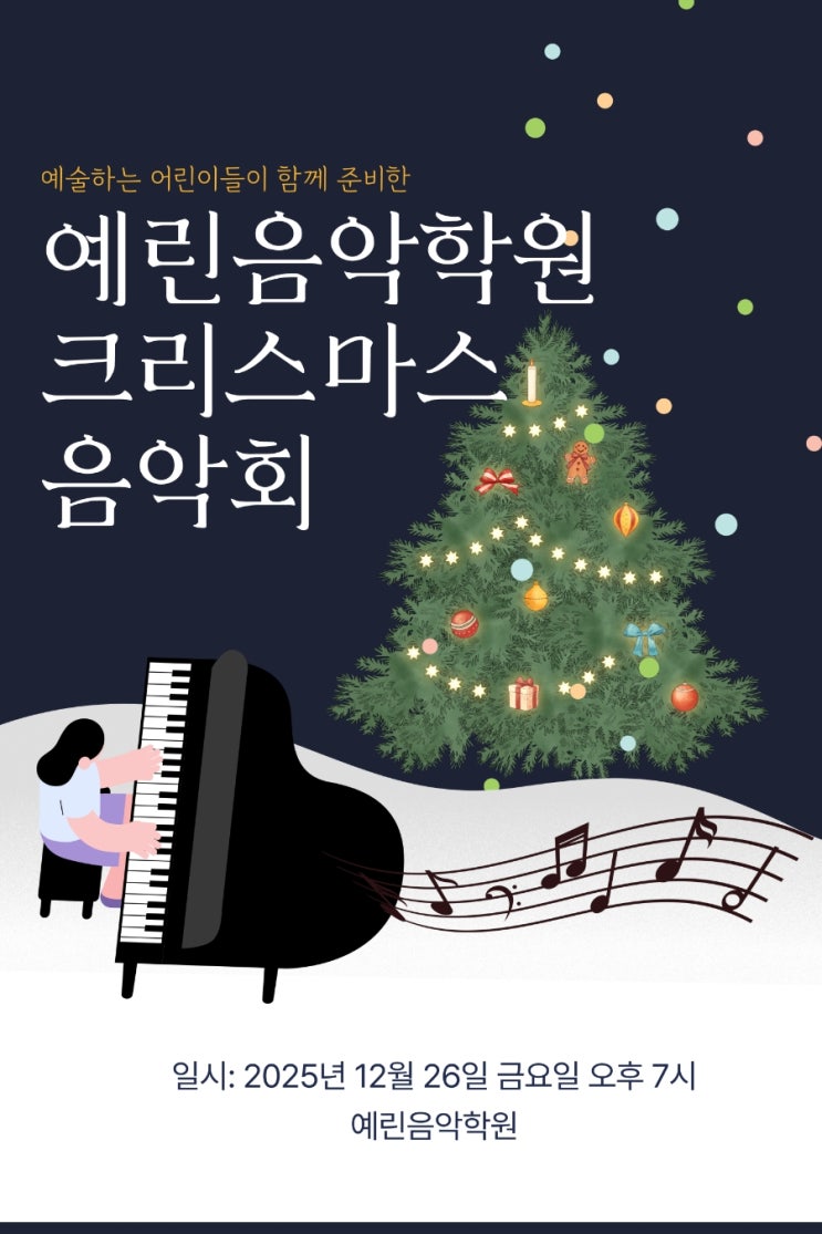 안녕하세요~ 예린음악학원입니다! 오랜만에 연주회 소식으로 돌아왔습니다~ 크리스마스를 맞이하여 우리 아이들이 열심히 준비한 크리스마스 연주회가 2025년 12월 26일 금요일 저녁 7시에 예린음악학원에서 진행됩니다~ 많은 관심과 참여 부탁드립니다❤️ 상담문의 ❗️의정부시 가능로 34, 3층 ❗️가능초 도보 2분 (첫 타임 학교에서 픽업 가능합니다!) ☎️ 010-2915-9290 #가능초음악학원 #피아노드럼 #가능초피아노 #흥선동피아노 #가능동피아노 #의정부음악학원 #의정부피아노 #첫글 #의정부예린음악학원 #유치부피아노 #의정부 #크리스마스트리 #크리스마스 #크리스마스연주회 <img src="https://blogthumb.pstatic.net/MjAyNTEyMTFfMTE1/MDAxNzY1NDM1ODQwMzU2.o1_weB5emSE3LaECC4O8o1dRsFtK5I54vcfqYZwdF_og.7UbgV-ItqKRQrIOcwWHKTdnA-d3if-d0hNWrXPiXaYQg.JPEG/900%A3%DF1764147879977.jpg?type=s3" />