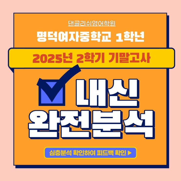안녕하세요, 댄글리쉬 영어학원 입니다. 이번 명덕여중 1학년 기말고사는 “문법 난도는 낮지만 독해·사고력 난도는 뚜렷하게 올라간 유형” 이었습니다. 서술형이 없음에도 불구하고 장문 지문 비중 증가, 문맥 속 지칭 파악, 연결어·전개 구조 판단, 주제·의도·감정 해석 문제들이 다수 출제되어 전반적으로 단순 문제풀이를 많이 한 학생들에게는 꽤 어려운 시험이었습니다. 중간고사보다 체감 난이도는 ‘중상’ 수준, 특히 등장인물의 감정 변화 추적, 글의 메시지 이해, 문단 간 논리 관계 연결 “2학년형 사고력 독해”를 미리 끌어쓴 구성이 특징입니다. 문법 기반이 약한 학생 → 그나마 수월했을 가능성 독해가 약한 학생 →....... <img src="https://blogthumb.pstatic.net/MjAyNTEyMTFfMzkg/MDAxNzY1NDI5OTg2ODc5.k9PebmQDP9Mq1RaCn0sNTB9Ri1cijsxNPS7hrkU1KGYg.B_RhRd6BF-bniaQGsvDXGFPCBOYIvuH12-RsfndUMtQg.JPEG/%B1%E2%B8%BB%B0%ED%BB%E7%BA%D0%BC%AE%BC%AE.jpg?type=s3" />