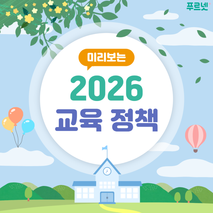 안녕하세요. 푸르넷입니다! 벌써 올해의 마지막 달이 찾아왔네요! 오늘은 새해를 맞이하기 전, 변경되는 교육 정책에 대해 미리 알아보고 준비할 수 있도록 2026 교육 정책의 핵심을 함께 알아보아요! 01. 모두를 위한 AI 인재 양성 (AI for All) 2026년부터는 초등학교와 중학교의 AI 교육시간이 대폭 확대될 예정이에요. AI 교육과정 개정을 추진하고, AI 윤리 교육 및 비판적 사고력 함양을 위한 ‘질문하는 학교’, 선도학교 운영 확대를 추진할 계획이라고 합니다! * 문제 해결 중심 교육 : AI 활용을 통해 단순 암기식 교육에서 벗어나 문제 해결 중심 교육으로 진화해요! * AI 중점학교 : 전국 초·중·고 1,000개 학교를 AI 중점학교로 지....... <img src="https://blogthumb.pstatic.net/MjAyNTEyMDNfODgg/MDAxNzY0NzM2NjIwNTUw.G1-Eds5lXFeOaa_nFaqjPnlkv0IqMyUkL0F3gI7forEg.n-S52BNIiduQ7XF1zK5cLwrBvr0bF4G4SVfFiNCUbxsg.PNG/%BA%ED%B7%CE%B1%D7%BF%EB_%BD%E6%B3%D7%C0%CF.png?type=s3" />