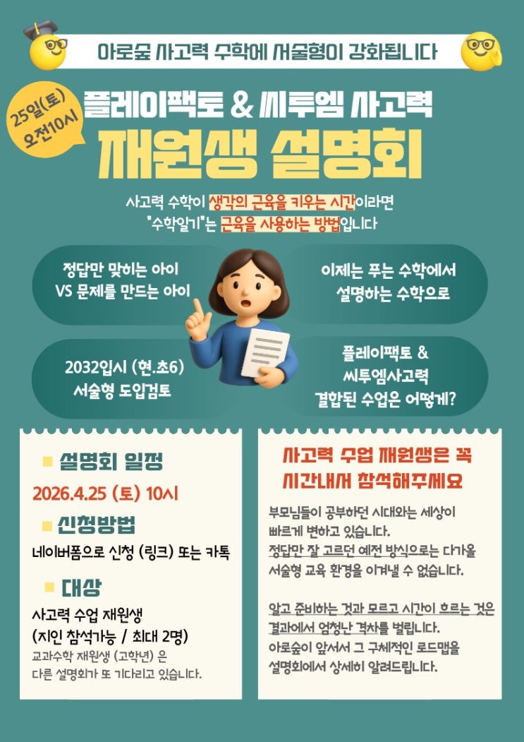 설명회라고 쓰고 우리만나요라고 읽어요 교육에 관심있으신 분이라면 3개월전부터 교육유투브가 2032대입개편 이라는 키워드로 시끄러운거 아시죠? 교육의 흐름이 ➡️ 정답을 요구하는 평가에서 ➡️ 과정을 요구하는 평가로 바뀌고 있습니다 말만 그렇지 그게되겠어? 라고 생각하시나요? 먼 미래인데 아직 어린데 무슨상관? 이라고 생각하시나요? 놉!아로숲과 미리 준비하세요 아이들은 주변어른들이 중요하게 생각하고 강조하는 방향으로 보고 자라게 됩니다! 그 방향으로 전력질주하는지 기어가는지는 아이의 선택이지만 적어도 방향은 잡아주자구요 설명회 때 씨투엠사고력과 플레이팩토 사고력 수업 커리큘럼도 들으실 수 있습니다....... <img src="https://blogthumb.pstatic.net/MjAyNjA0MTNfMjkx/MDAxNzc2MDQzNjU3MDE1.2uiNwsp28t6u93BkNPwleXgt18exd5uJtIXPKKk8Wkog._z0zsGXObTT-JkFfWfkoc4nNiJvIOzMHvqeWJP2LVPMg.JPEG/1776042421712.jpg?type=s3" />