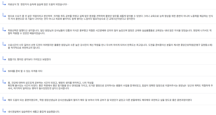 은평구 간호학원의 중심, 간호인재양성의 중심 중앙간호학원 안녕하세요. 중앙간호학원 원장입니다. 올해 수료후 자격증을 취득하고 취업의 시간을 보내고 있는 단합력 최고, 모의고사 평균점수 최고였던 51기 분들의 수강후기입니다. 작년 가을부터 올해 여름까지의 1년간의 이야기(51기) "의료상식 및 현장지식 습득에 실습에 많은 도움미 되었습니다!ㆍ" "앞으로 수요가 클 것 같은 직업이라고 판단하여 자격증 취득 공부를 하였고 실제 업무 환경을 견학하며 몰랐던 업무를 새롭게 알아볼 수 있었다 그러나 교육으로 능력 향상을 위한 훈련이 아니라 노동력을 제공하는 인식이 커서 훈련으로 내 기술이 나아지는 것이 아니고....... <img src="https://blogthumb.pstatic.net/MjAyNTExMjBfMjg3/MDAxNzYzNjI5ODQ0MTY4.BxfxrBswLXPboOs2UxDBZVwcjKzBPr-vD-yHPTHr_Zog.ymsw_KPw4CE8MxjXjDxckd59-bm7iSHz4MxEm2onBjUg.PNG/image.png?type=s3" />