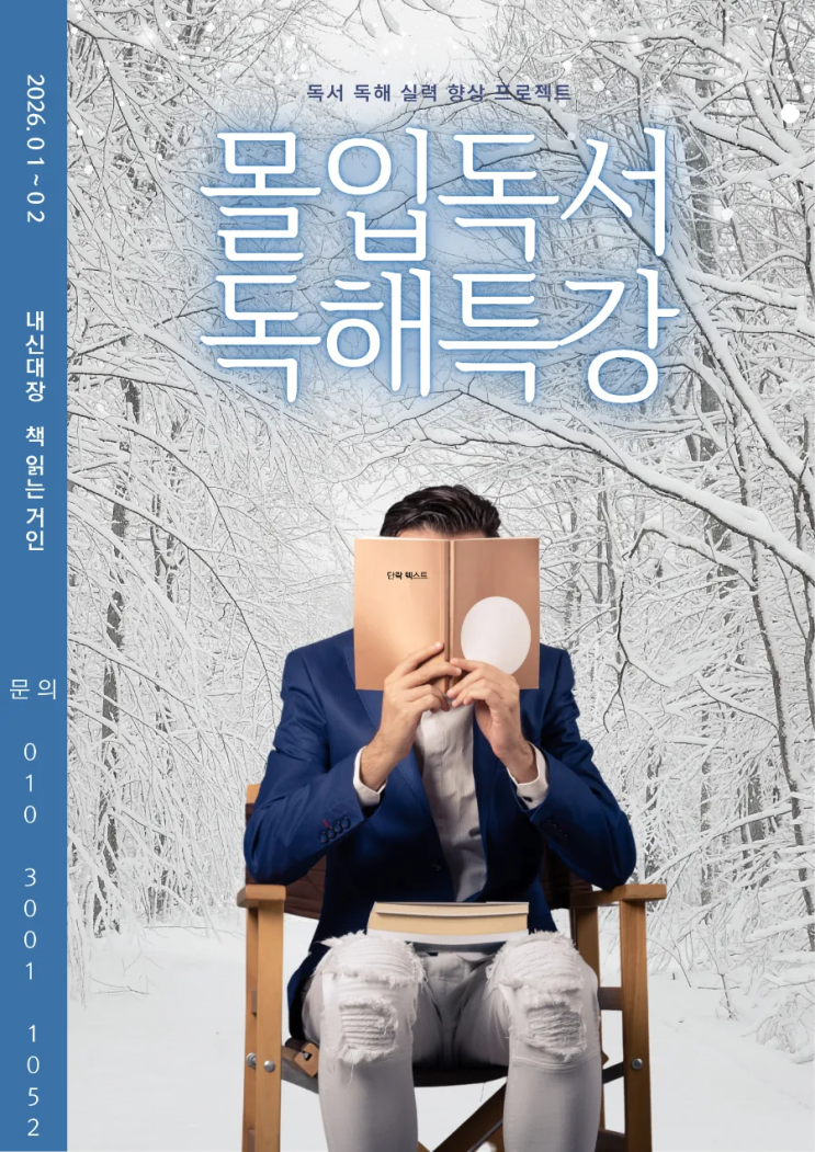 오전특강이 돌아왔습니다~! 이번에는 뇌를 완전히 리셋하는 몰입독서/몰입독해 프로그램입니다~ 이번 수능만점자의 인터뷰에서도 확인되었죠? 초등 중등때 독서가 언어영역의 힘이었다고요~~ 독서는 뇌의 전 영역을 활성화시키는 최고의 학습입니다~!! 이번 특강은 단순한 책읽기에서 끝나는 것이 아닌! 좌뇌/우뇌를 동시에 자극함으로 뇌의 올바른 균형을 돕는 것은 물론!!! 집중력 훈련/ 다독/ 속독/ 독해까지 한꺼번에 잡는 훈련입니다~ 대상은 초등 5학년~ 중등까지이며 100권의 책 읽기 도전과 독해훈련 요약훈련까지 월/화/수/목/금 매일 진행합니다!! 방학특강 특가로 진행되오니 선착순 마감되기 전에 서둘러 주세요!!! 인천 중구 하늘별....... <img src="https://blogthumb.pstatic.net/MjAyNTEyMTFfMjYz/MDAxNzY1NDU3Mjk4ODE2.YfnmYG9OqS-f0aAgvpk-WuMy06zGMVUhTzJpbdcZcZAg.42sh-2f_yES-YdZytcPxkn8wfWExce7oRhCZAgWSisgg.PNG/900%A3%DF1765448189296.png?type=s3" />