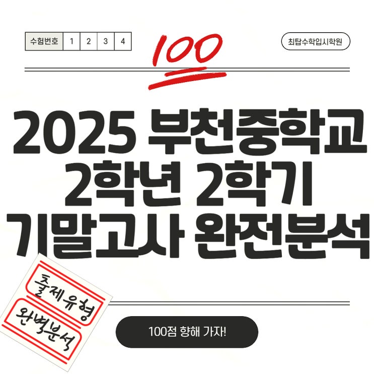 안녕하세요 최탑수학 입시학원입니다. 2025년 12월 11일 부천중학교 2학년 2학기 기말고사가 마무리되었습니다. 오늘은 부천중학교 2학년 2학기 기말고사 분석을 해 보겠습니다. 2025학년도 부천중학교 2학년 2학기 기말고사 분석 개요 출제 단원 배점 문항 분석 ※ 전국 분석 예상 정답률은 전국 학생 정답 분석으로 난이도와 다를 수 있습니다. 출제 난이도 분석 전체적인 분석 전체적인 난이도 흐름을 보면 시작부터 중, 상 난이도 문제가 출제되고 문항번호에 따라 난이도가 고르게 분포되어 시험을 치르면서 멘탈 또는 시험을 보면서 계획적으로 시험 보는 방법이 익숙하지 않았다면 초반부터 힘들었을 것으로 보입니다. 최상 난이도 문제 1....... <img src="https://blogthumb.pstatic.net/MjAyNTEyMTNfMjE0/MDAxNzY1NjE5MjQ5ODg2.ca0zj1uLWDDdC_Q3ZnSFNS_OF6VydbIy2ie08L1KcQcg.iu7D-MfI2U1zdmjvA9tJ9CDtlRdCP6k0eCLaRubjRv0g.JPEG/%C1%A6%B8%F1%C0%BB_%C0%D4%B7%C2%C7%D8%C1%D6%BC%BC%BF%E4_-001.jpg?type=s3" />