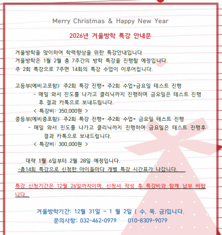 겨울방학 특강 안내입니다 재원생 대상입니다^^ <img src="https://blogthumb.pstatic.net/MjAyNTEyMDhfMTY2/MDAxNzY1MTk4Mzk5MzEw.PK7LnAvoXkhA45mmCI687J4DpKnTBbOLikcA7hhTQnYg.aNF665RHIDKNZpnveAY5y-EJsdWYLx5R6Yg-DIpdOK8g.PNG/1764827346521.png?type=s3" />
