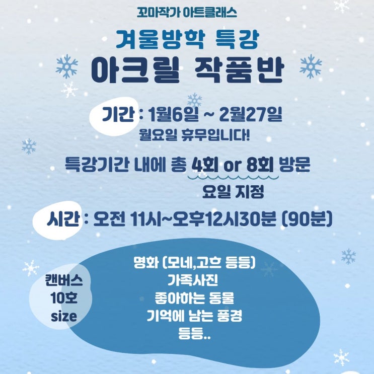 10호짜리 대형 캔버스 위에, 아크릴 물감을 이용해 작품을 완성하는 아크릴 작품반 특강 모집합니다 ♥ 총 4회 혹은 8회동안 방문해서 그림을 완성시키면 됩니다~ 4회당 그림 1개 입니다! 8회 신청시, 그림이 총 2개가 완성됩니다! (8회 신청시, 할인됩니다) 시간: 오전 11시 ~ 오후 12시 30분 총 90분동안 진행되며, 혹시 빠지게 되면, 주말 (토,일) 오전11시~오후12시30분 보강 가능하니 편하게 이용해 주세요^^ 그림을 처음그리는 친구들 대 환영합니다! 아크릴 물감은 물감위에 물감이 덮이기 때문에 수정이 쉽다는 특징이 있습니다! 연필 잡는법, 위치 잡는법,색 만드는 법 모두 특강안에 포함되어 있으니 평소 그림에 관심많았던 친구들 많....... <img src="https://blogthumb.pstatic.net/MjAyNTEyMDdfMTMz/MDAxNzY1MTAwODc1NDE1.Z7kjwEj3fMsHlV_zL4oTTVGQkJhCJpojW7YEOIlyRbMg.Lz0B9V_7-Zdk8F9fROK0Anx2E5CvdEvdk_7lF7FVpVYg.JPEG/%C1%A6%B8%F1%C0%BB_%C0%D4%B7%C2%C7%D8%C1%D6%BC%BC%BF%E4.jpg?type=s3" />