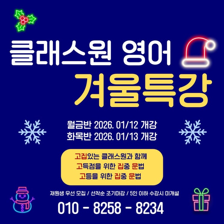 ❄️늦잠자지마! 클래스원 겨울방학 방학특강 ❄️ 이번 겨울방학의 소중한 오전시간 늦잠자지말고 고집있는 클래스원과 함께 고등을 위한 집중 문법 고득점을 위한 집중 문법 고.집.문 으로 완전 달라지는 영어 실력 2026 수능 영어에서 1등급 비율이 3% 이하로 예상되며, 절대평가라고 해서 결코 만만한 과목이 아니라는 것이 다시 확인되고 있습니다. 한동안 등한시되던 영어가 이제는 입시의 결정적 과목이 된 만큼, 이번 겨울방학은 새 학년을 맞이하며 실력을 단단히 다질 이음새가 되어줄 가장 중요한 시기입니다. 늦잠자지마 ! 한마디로 시작되는 클래스원의 집중 영어 클리닉 클래스원 선생님들의 노하우와 경력이 담긴 고.집.문 특강으....... <img src="https://blogthumb.pstatic.net/MjAyNTEyMTJfMTk2/MDAxNzY1NTQ0MTUyMDE0.T1kP6468nVM_85sfdLI39yLyxvlfSC6EDaPdJbFbsOIg.lSM5Fao1lAgRV0cnl6LTAChij6l77JYECO19sfYXBKEg.JPEG/%C6%AF%B0%AD%2C_%B9%E6%C7%D0%BE%C8%B3%BB%B9%AE.jpg?type=s3" />