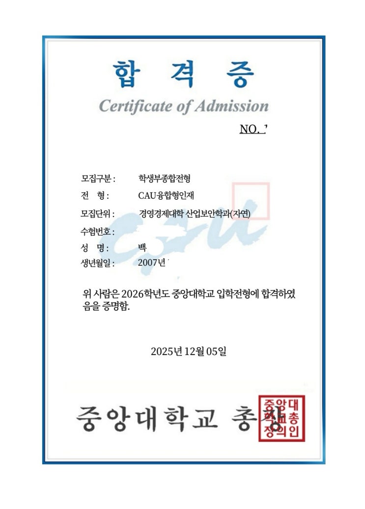 중앙대학교 최초합!!! 합격 소식 전합니다