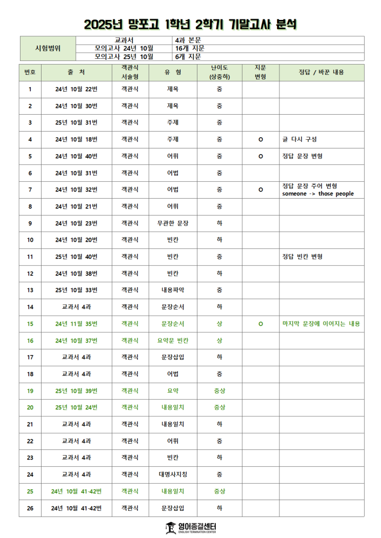 망포고에 딱 맞게 수업하는 곳 어디 없나? 여기가 진짜 학생 관리 잘 하는 학원일까? 진짜 영어성적 잘 나오는 곳 맞아? 망포고에 다니는 자녀가 영어시험을 망쳤나요? 자녀의 고등학교 영어공부가 불안하신가요? 지금까지 고등학교 영어 공부 어떻게 시켜야 하나 고민하느라 힘드셨죠? 15년 넘게 영어학원을 운영하다 보니 비슷한 고민을 가지고 계신 학부모님들을 수없이 만나왔습니다. 영어경력 15년 전문가인 제가 망포고 영어 성적을 올려줄 수 있는 학원을 찾는 방법에 대해서 알려드리겠습니다. 망포고 영어성적을 올려주는 학원을 찾는데 도움이 될 만한 3가지를 알아보겠습니다. 1. 망포고 전용반이 있는가? 학교별 전용반과 전담 선생....... <img src="https://blogthumb.pstatic.net/MjAyNTEyMTNfNzAg/MDAxNzY1NTU1OTAzODQ2.BjqAxPHI1KsuJVm7eJD0RsXpc7q4p65CLs5spoI4UVMg.tE1mYNlPseO-FuNGn7z2BNh3TE_ZfBsQTKZF3klDLHcg.PNG/25%B3%E2_%B8%C1%C6%F7%B0%ED_1%C7%D0%B3%E2_2%C7%D0%B1%E2_%B1%E2%B8%BB%B0%ED%BB%E7_%BF%B5%C1%BE%BA%D0%BC%AE%C1%F6001.png?type=s3" />